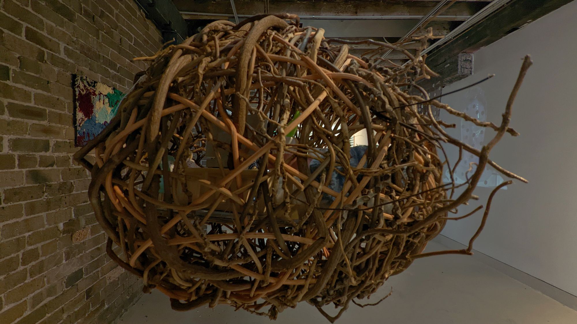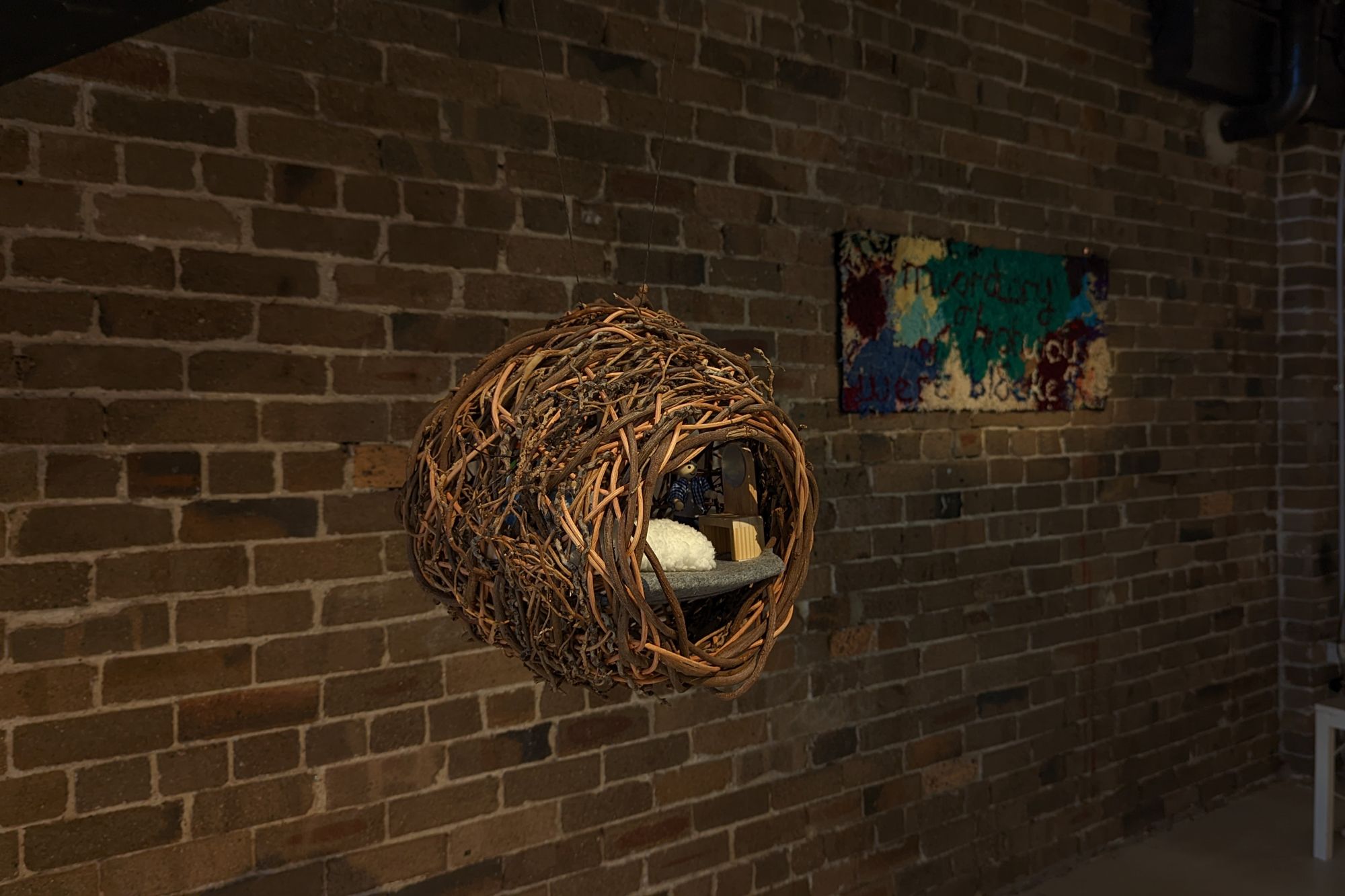 Vines, rattan, skewers, wooden dolls and toy furniture, 33 x 47 x 34 cm.