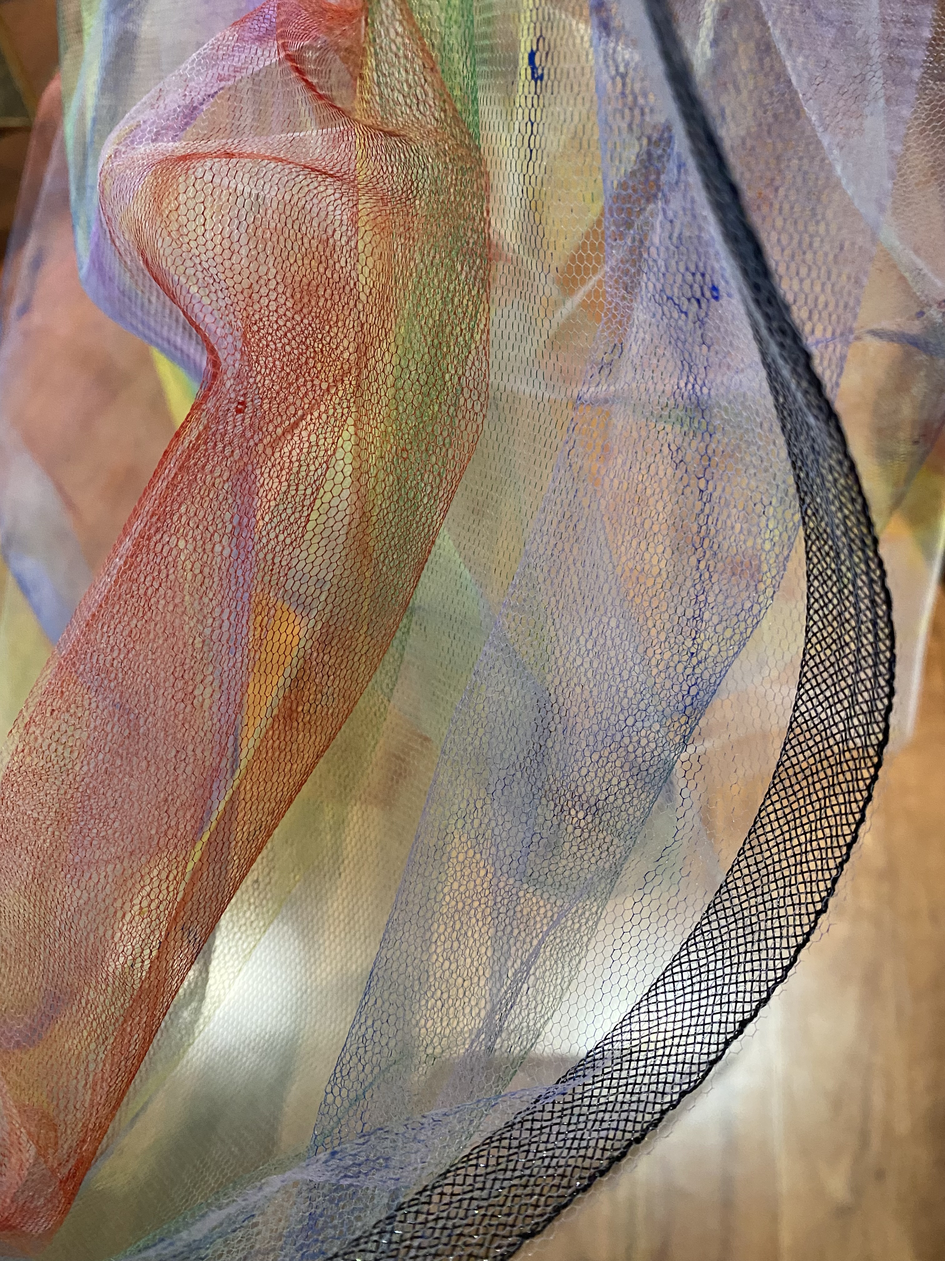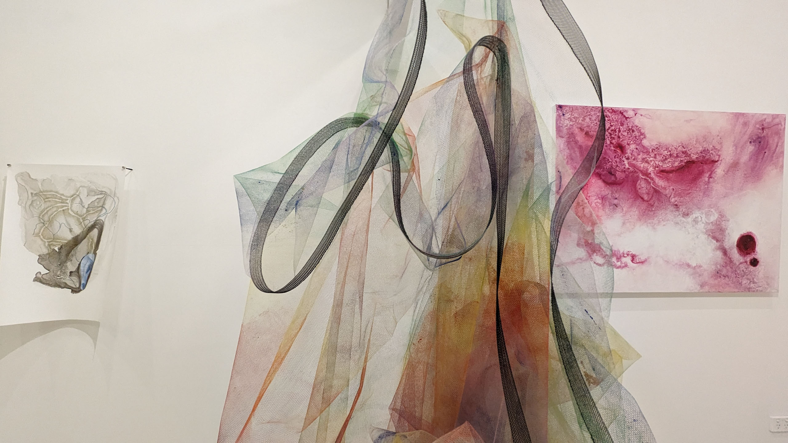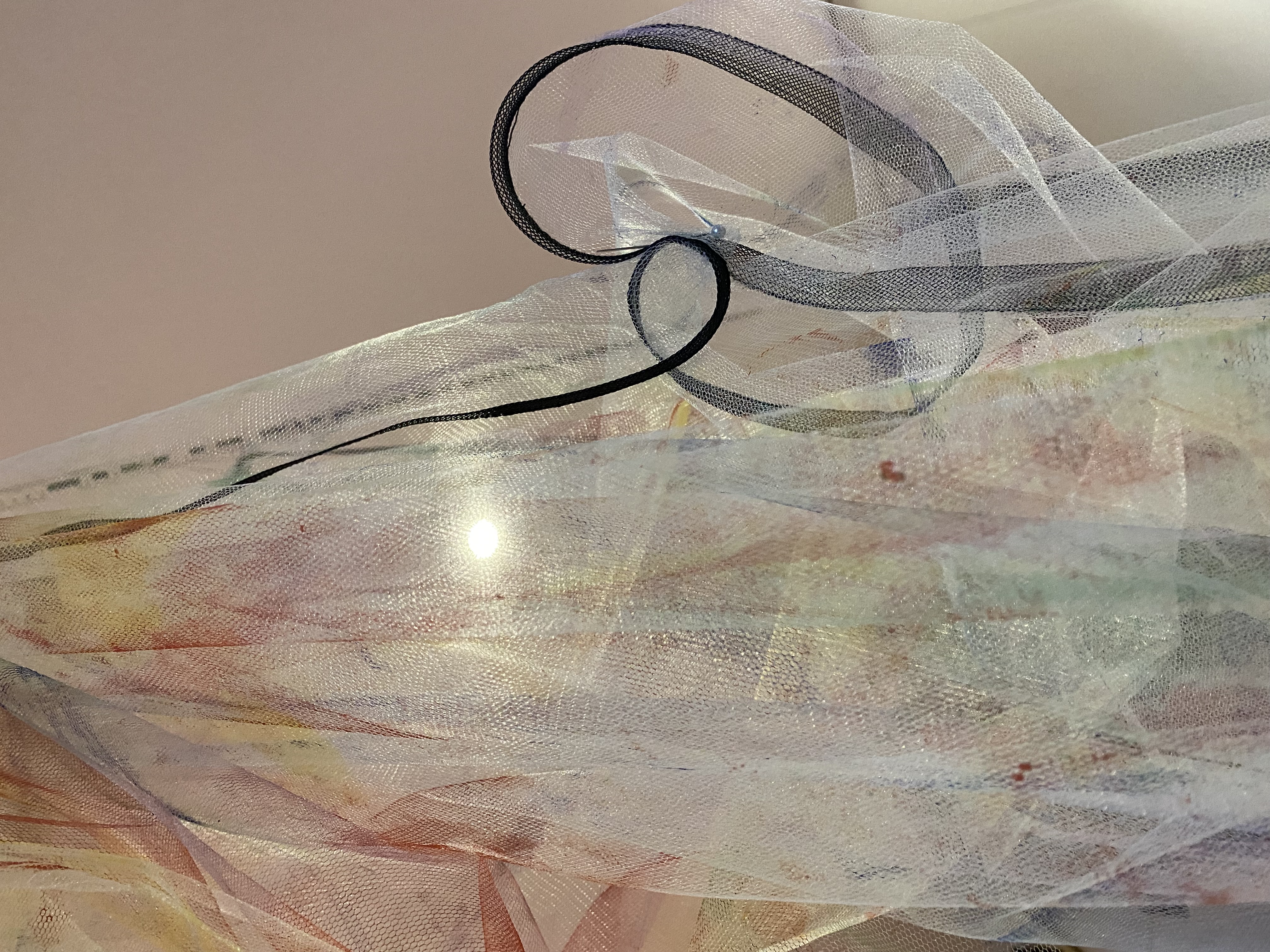 Variable dimensions. Tulle, acrylic paint, found industrial material, thread pins