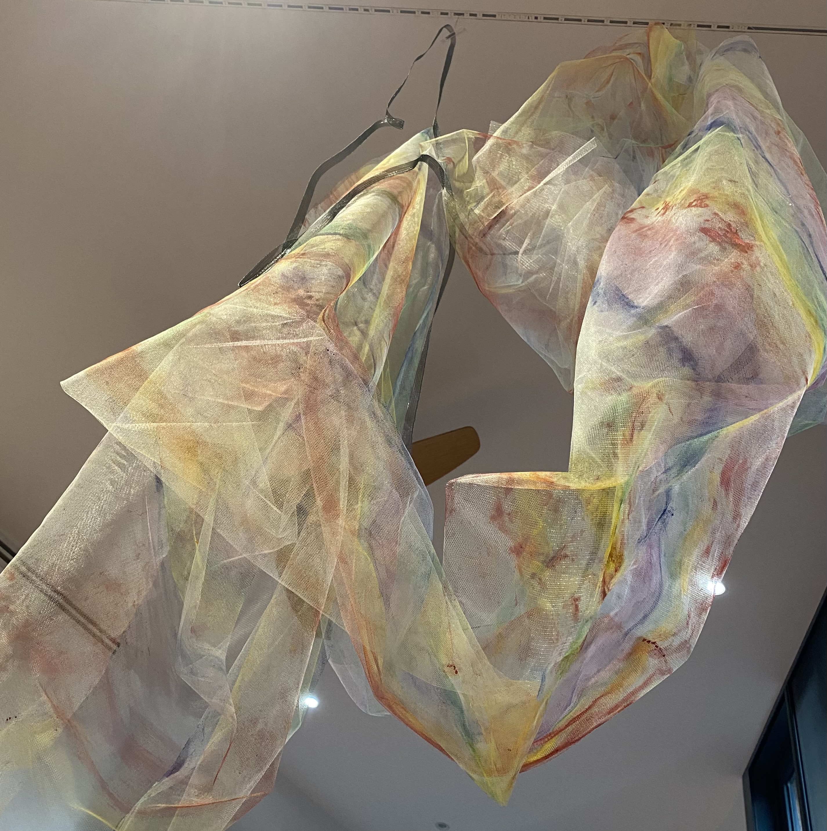 My art practice explores spatial and sensory possibilities of applied both in the process and the outcome of the work. Often using semi-transparent textiles and papers with paints, pigments and found objects evoking memories and feelings.