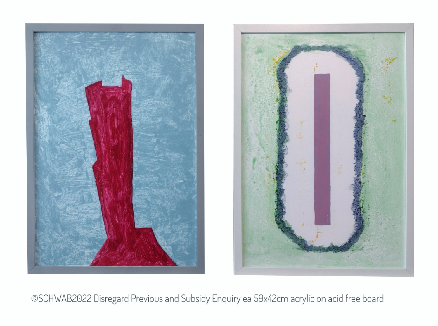 Two A2, each 62x44.5cm framed. Acrylic on acid free board.