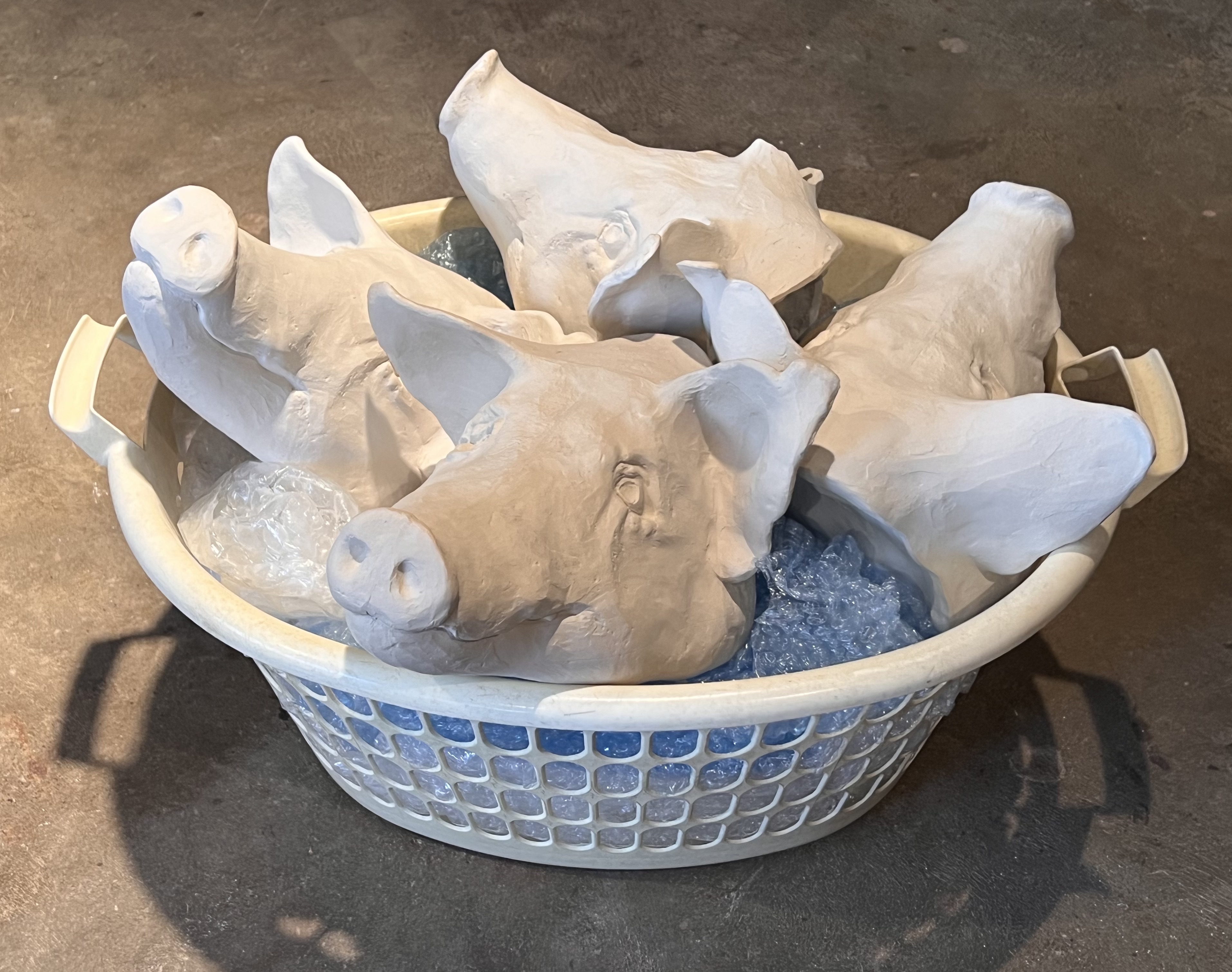 65 x 45 x 40cm. Clay slip, bubble wrap, plastic.