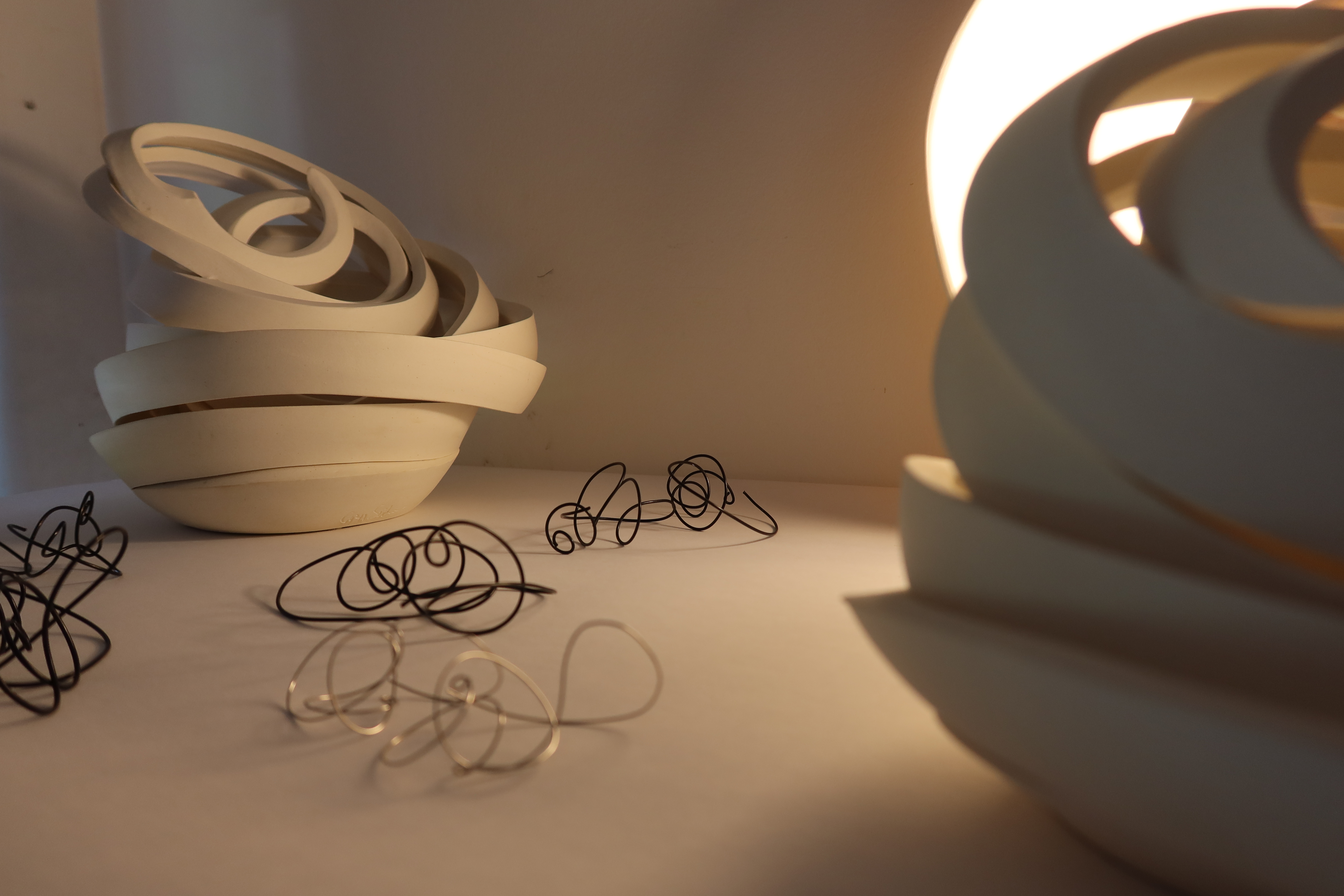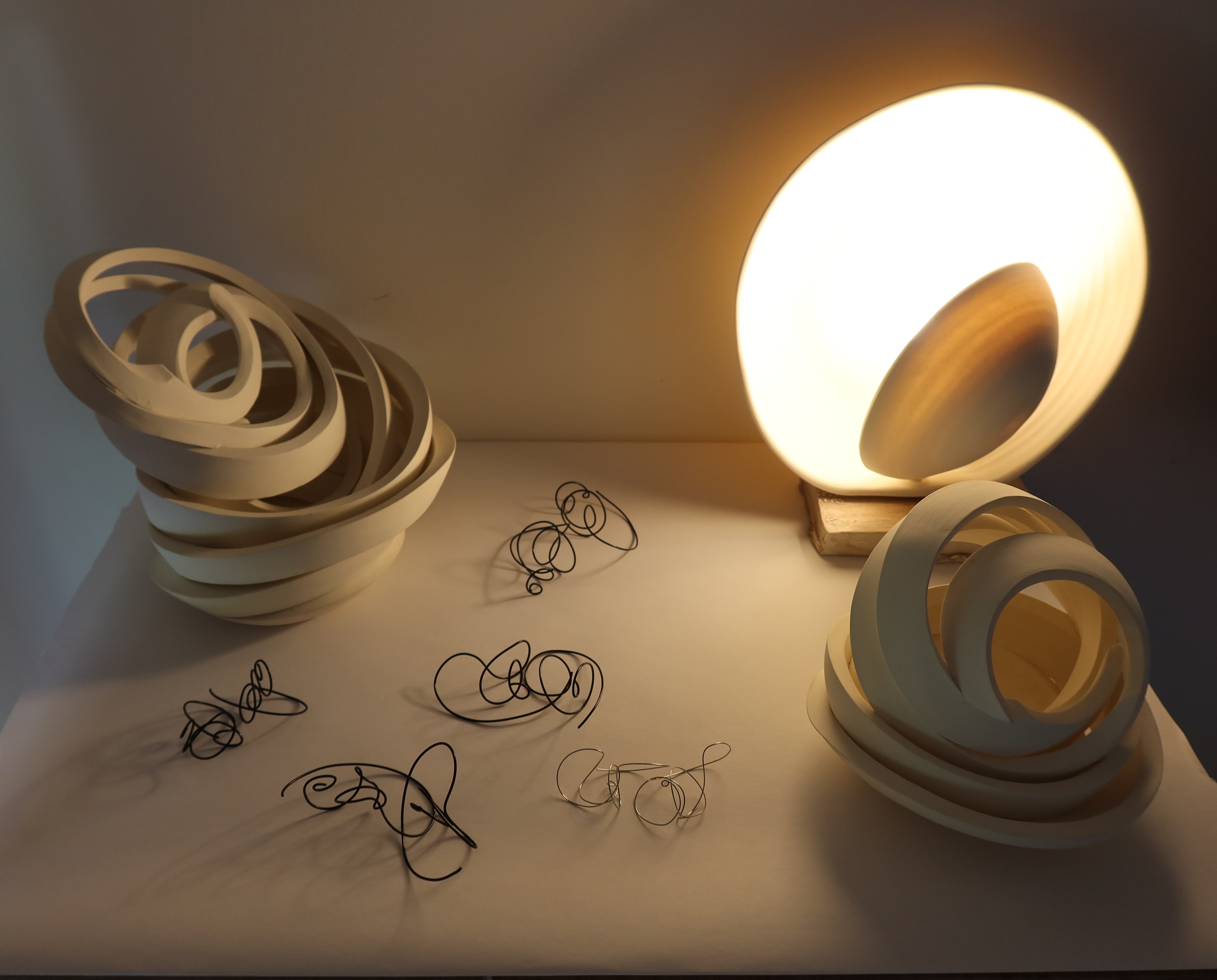 $50 ea for steel earrings | $400, $600 and $700 for porcelain objects/ light