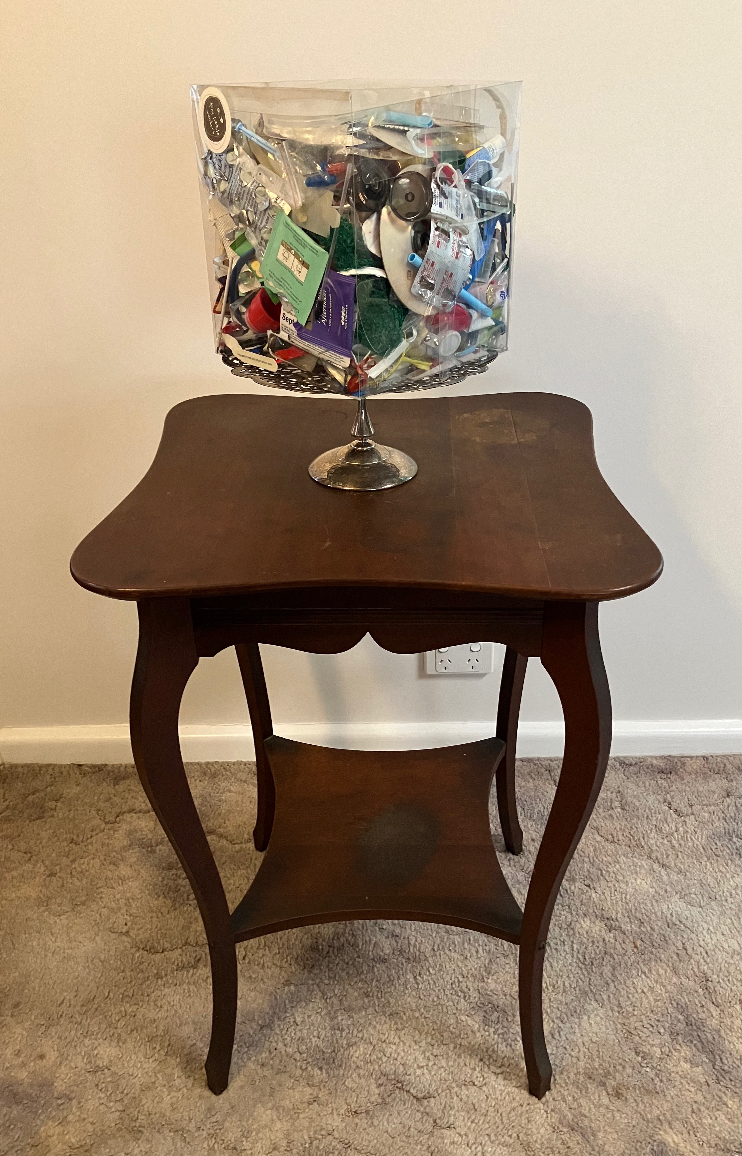 Plastic waste, found plastic packaging, vintage cake stand, occasional table, 107x51x51cm