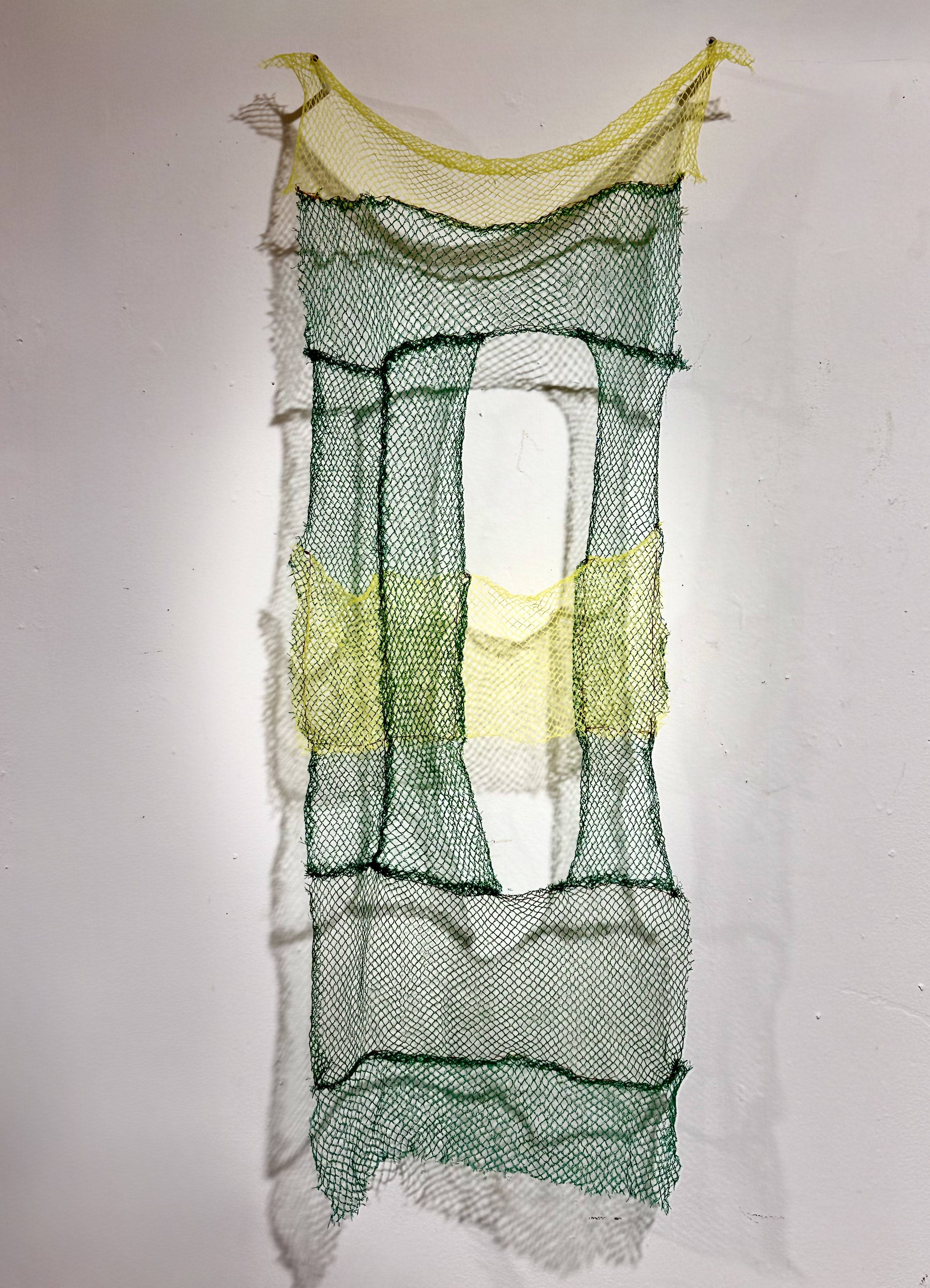Reductive artwork with fruit nets, onion bag threads and metal wall holders, ca 108x50x10cm