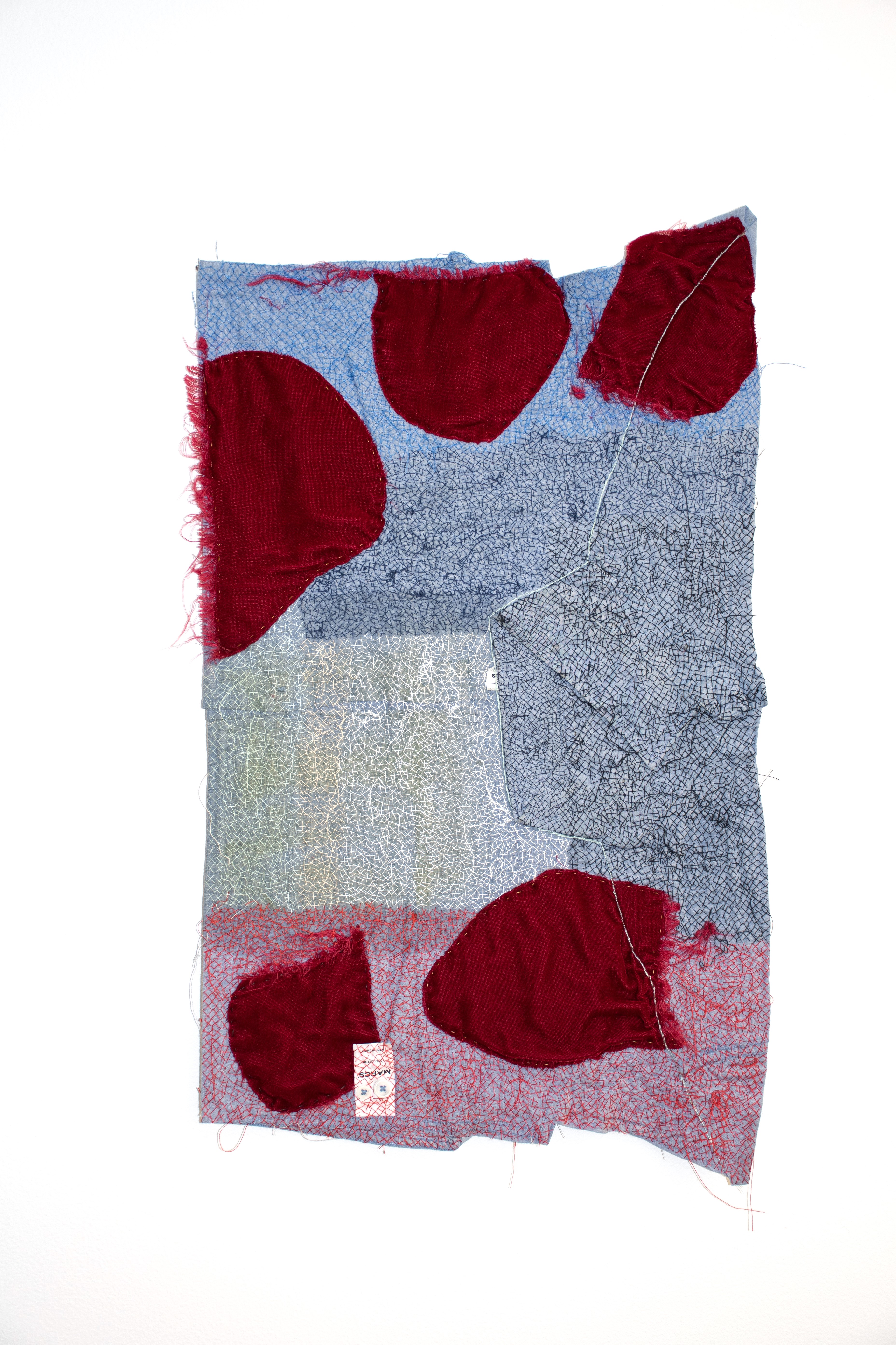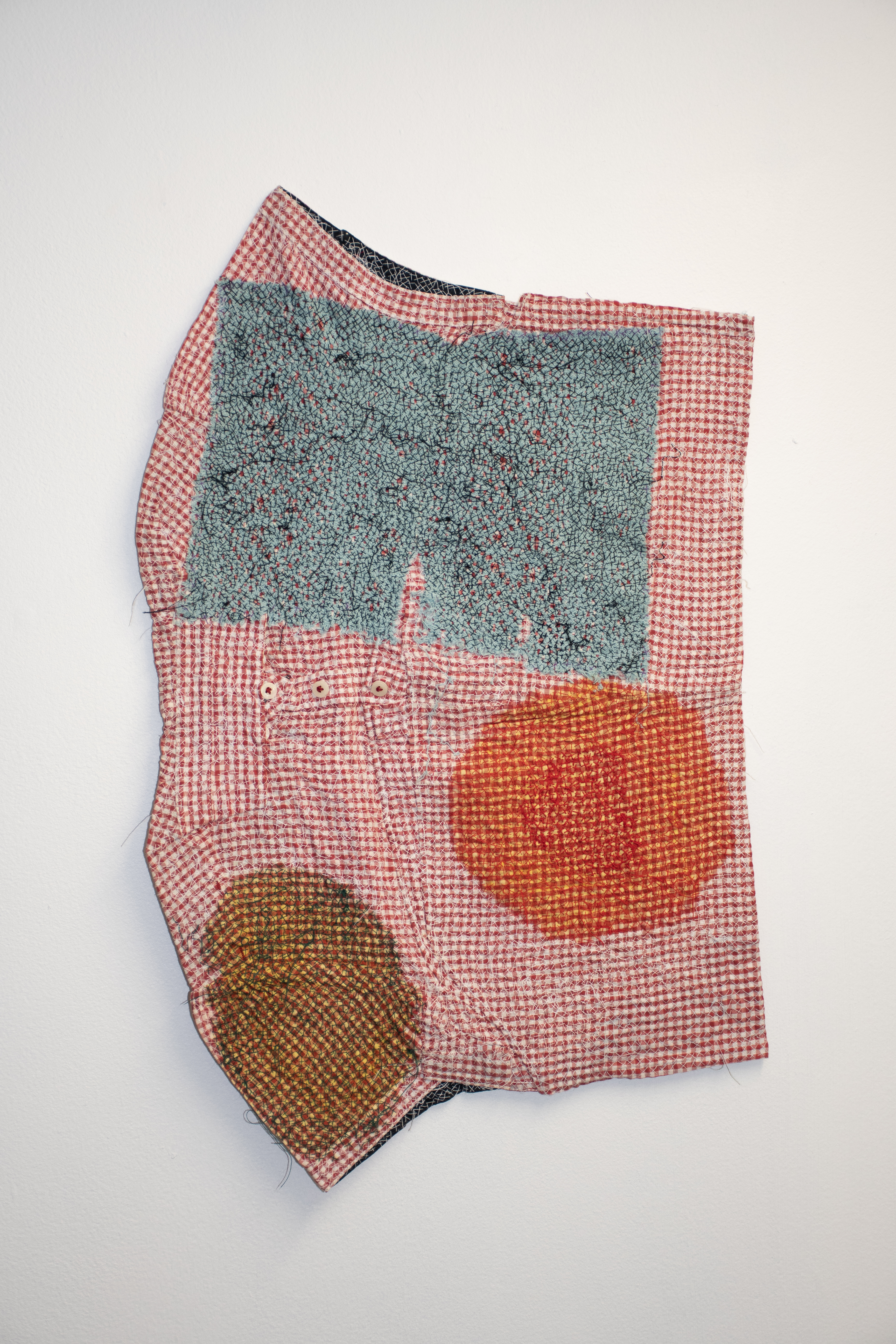 Remediation IX, 2022-23 turmeric stain, fabric scrap and thread on reclaimed shirt, 59 x 38 cm
