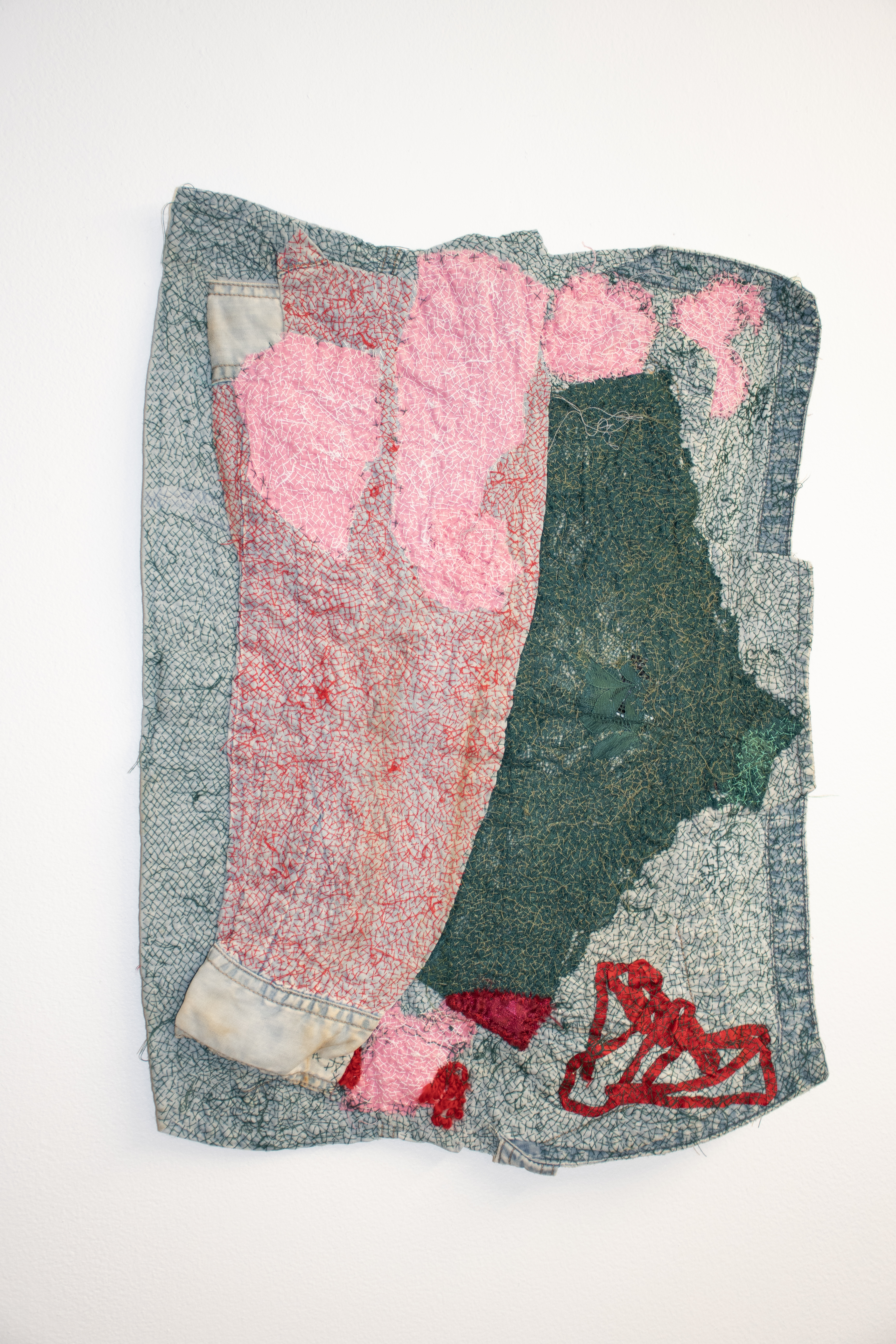 Remediation VIII, 2022-23, tea stain, thread, ribbon, panties and fabric offcuts on reclaimed shirt, 51 x 37 cm