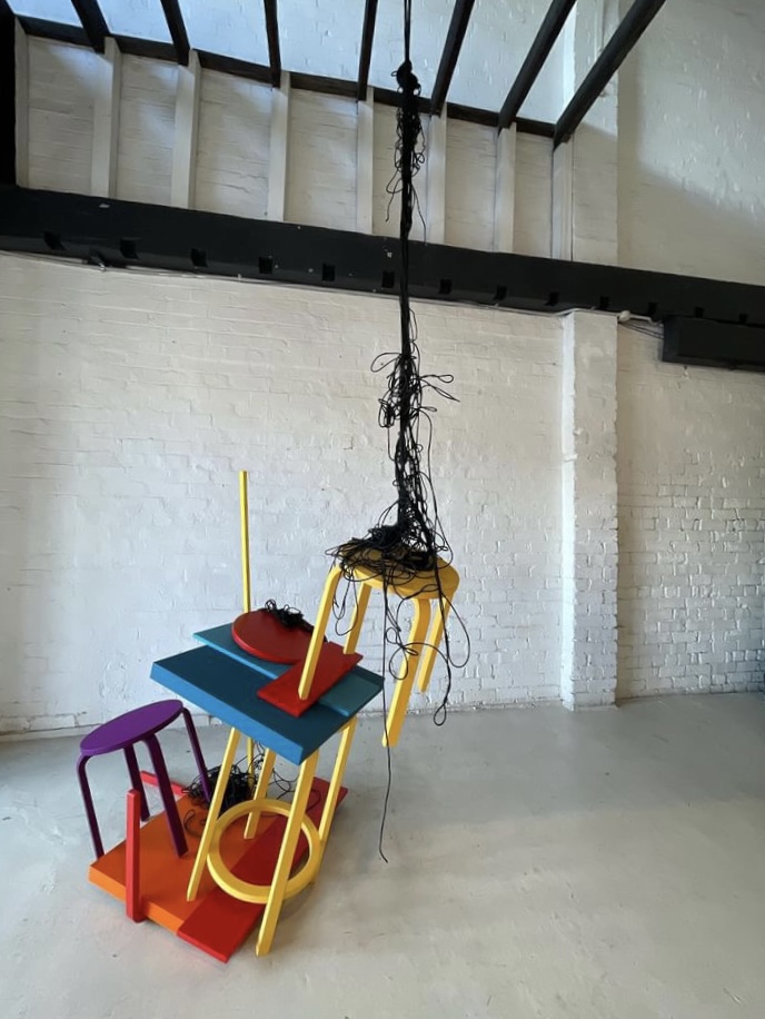 Plywood stackable stools, IKEA tabletops, MDF, wood, paint, rope, shock cord, dimensions variable, 2024