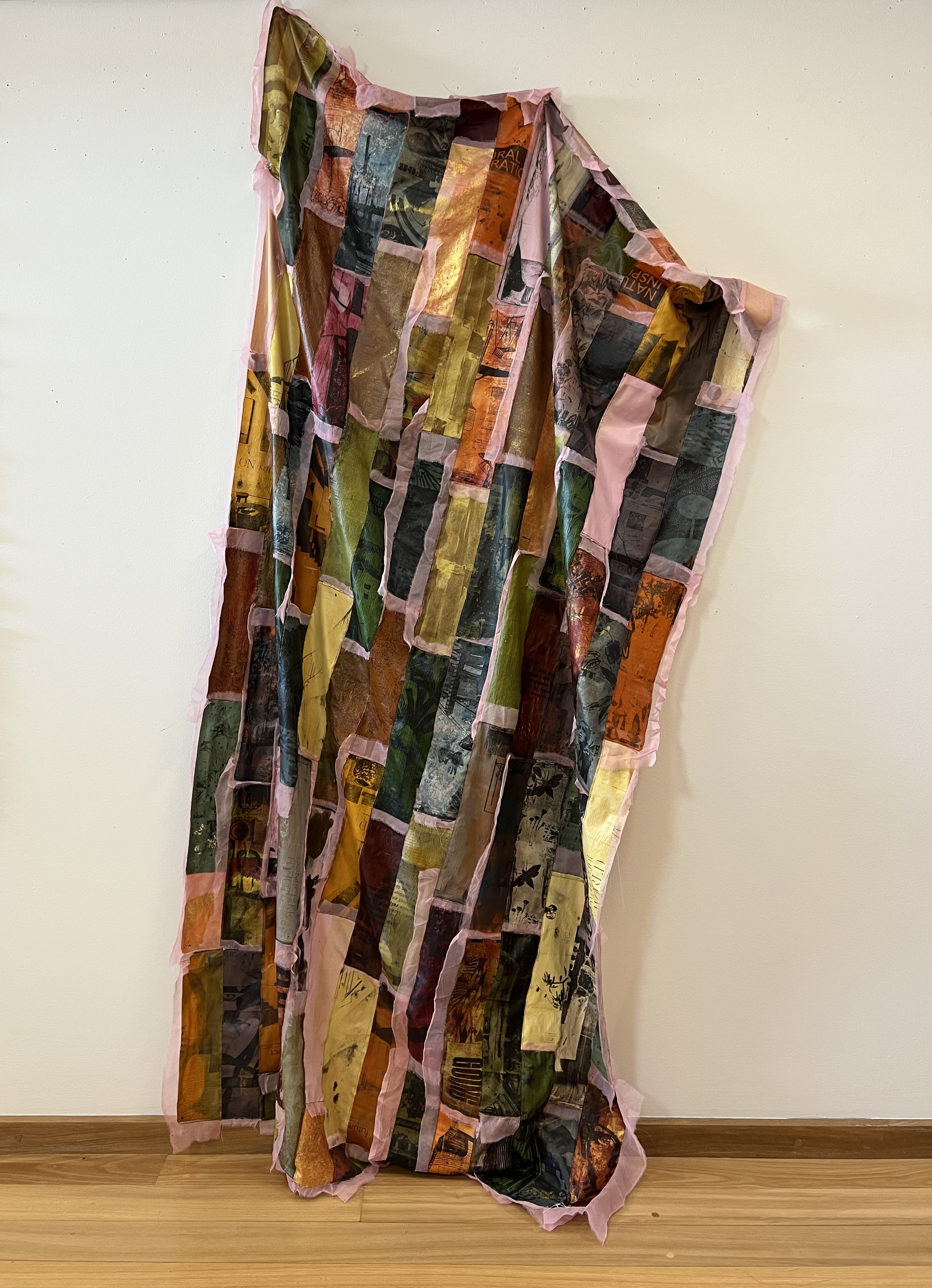 Printed crushed paper, fabric and stitching are prominently featured in my practice. The venture into paint skins is new and a product of playing with a non conventional form of printing off a gelliplate.