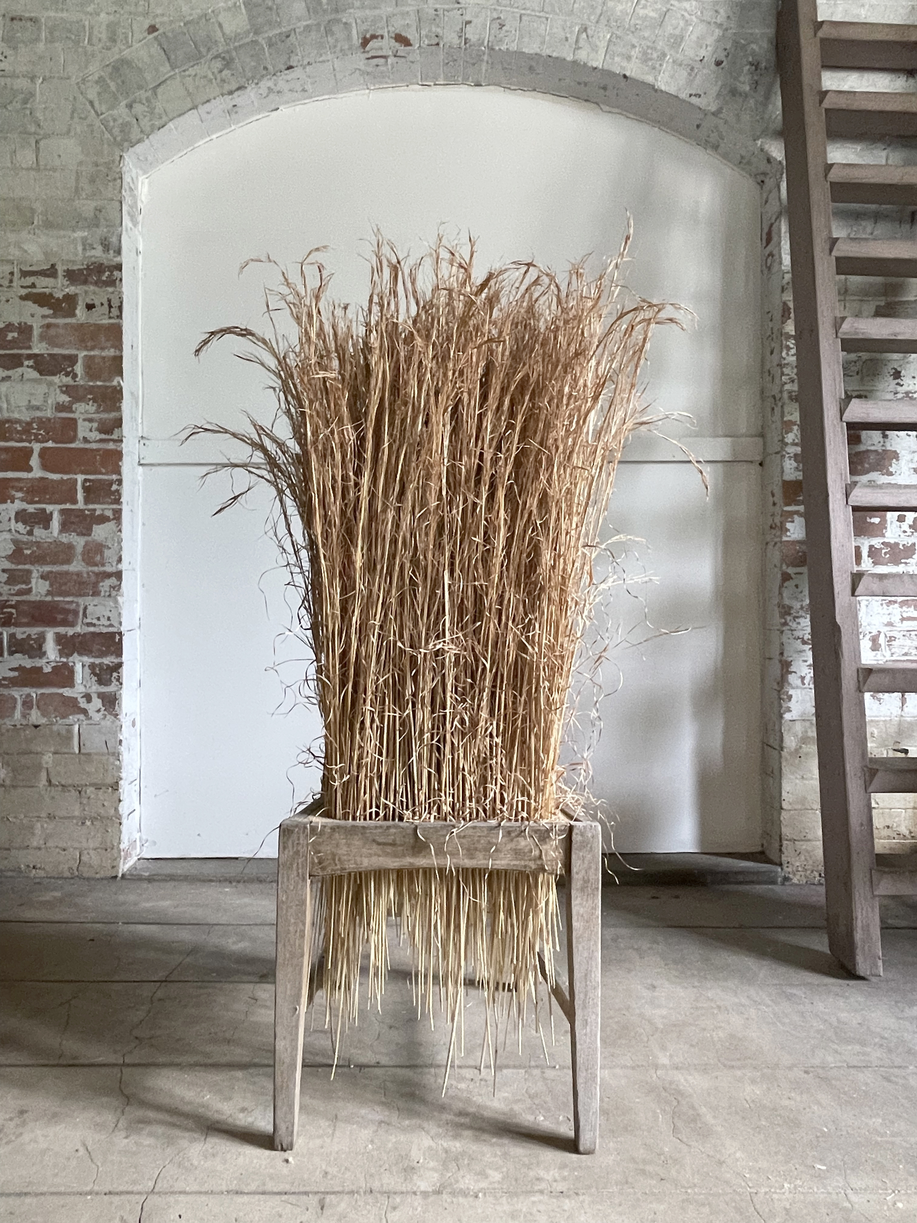 The Grass Chair, 2023, found wooden chair and weeded whiskey grass and beeswax. 145 x 45 x 45 cm (approx)