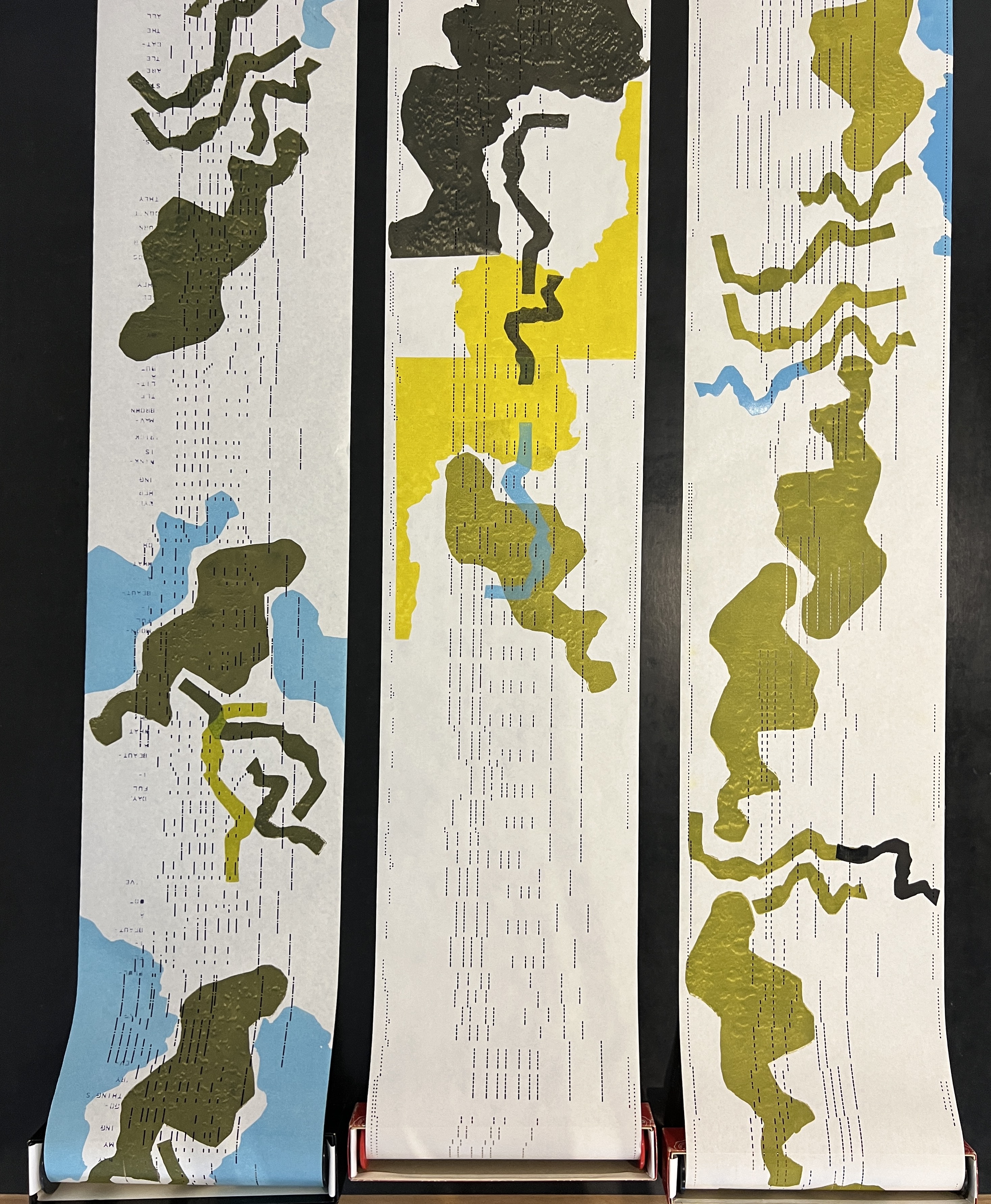 Lino print on pianola rolls, size variable (max 4.4m long), 2023.
