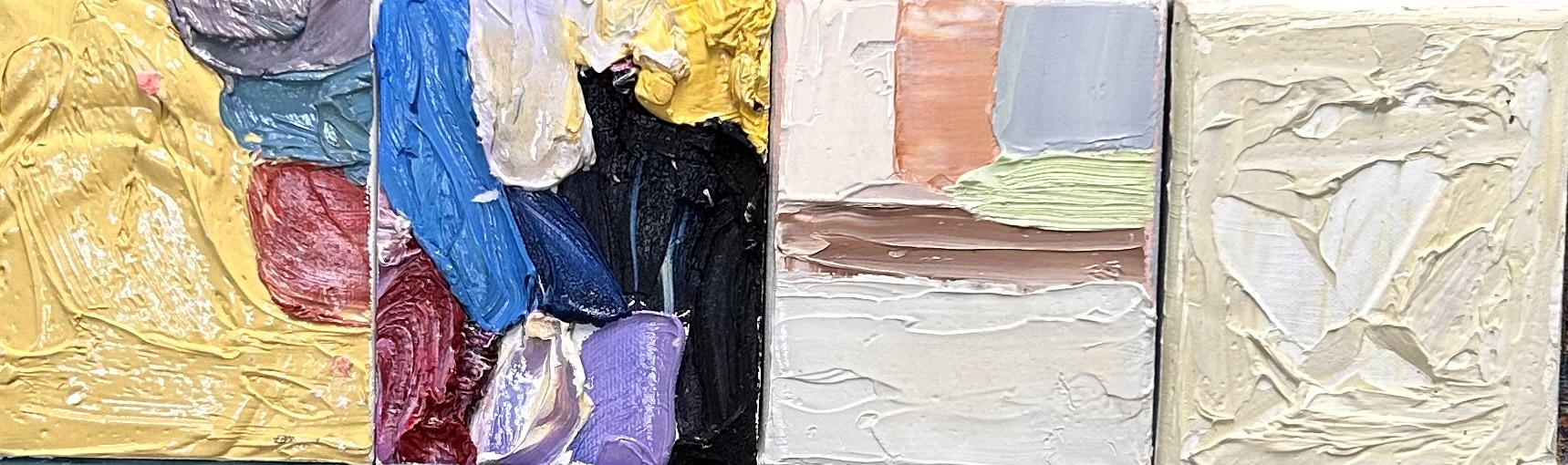I paint daily for 20 minutes on small canvases from left over paint to maintain consistency, experimenting in colour without a strict plan to focus on mark making and emotional response.