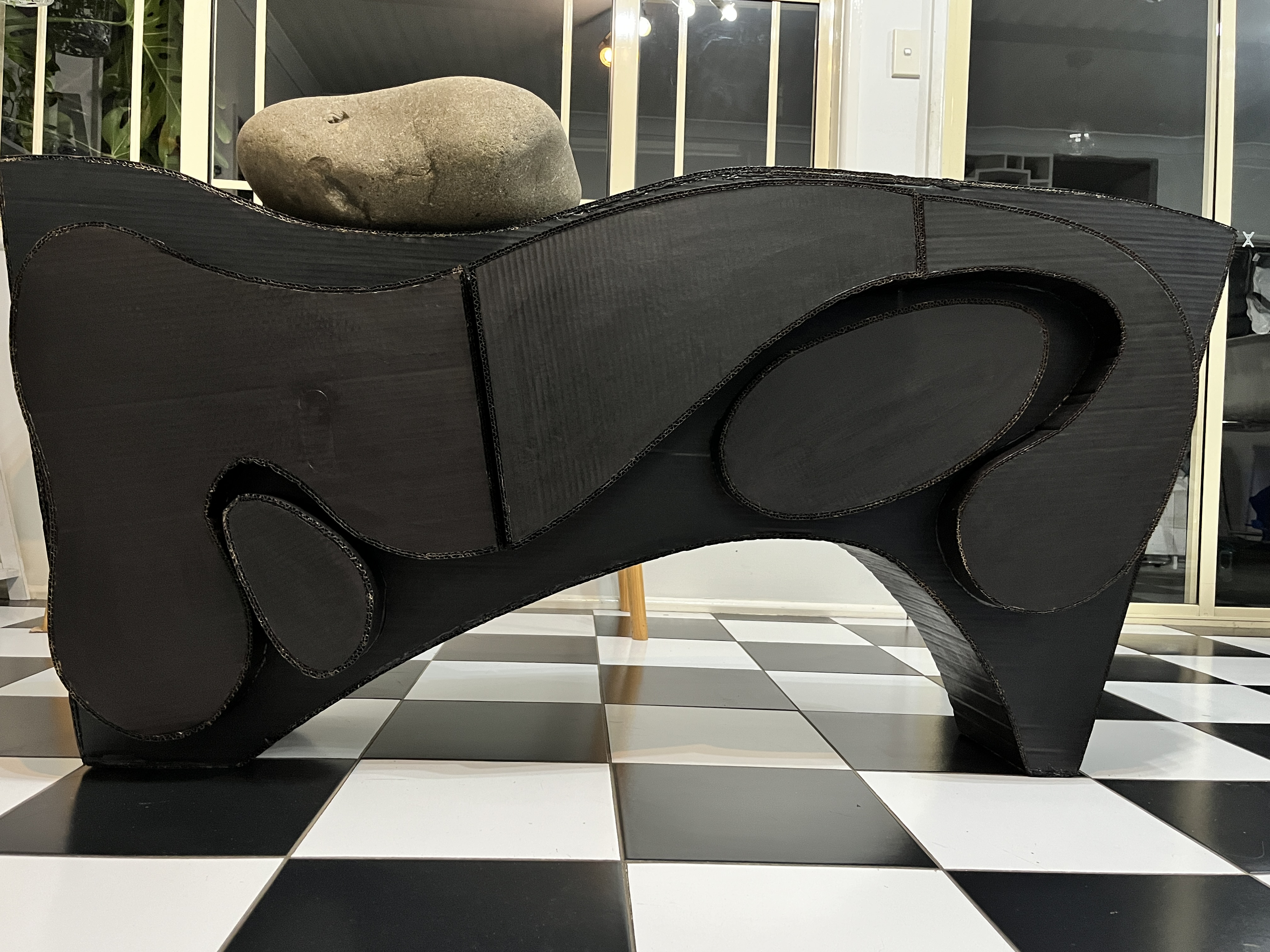 Painted recycled cardboard and river stone (25kg), 1500mm x 830mm x 370mm, 2025-26