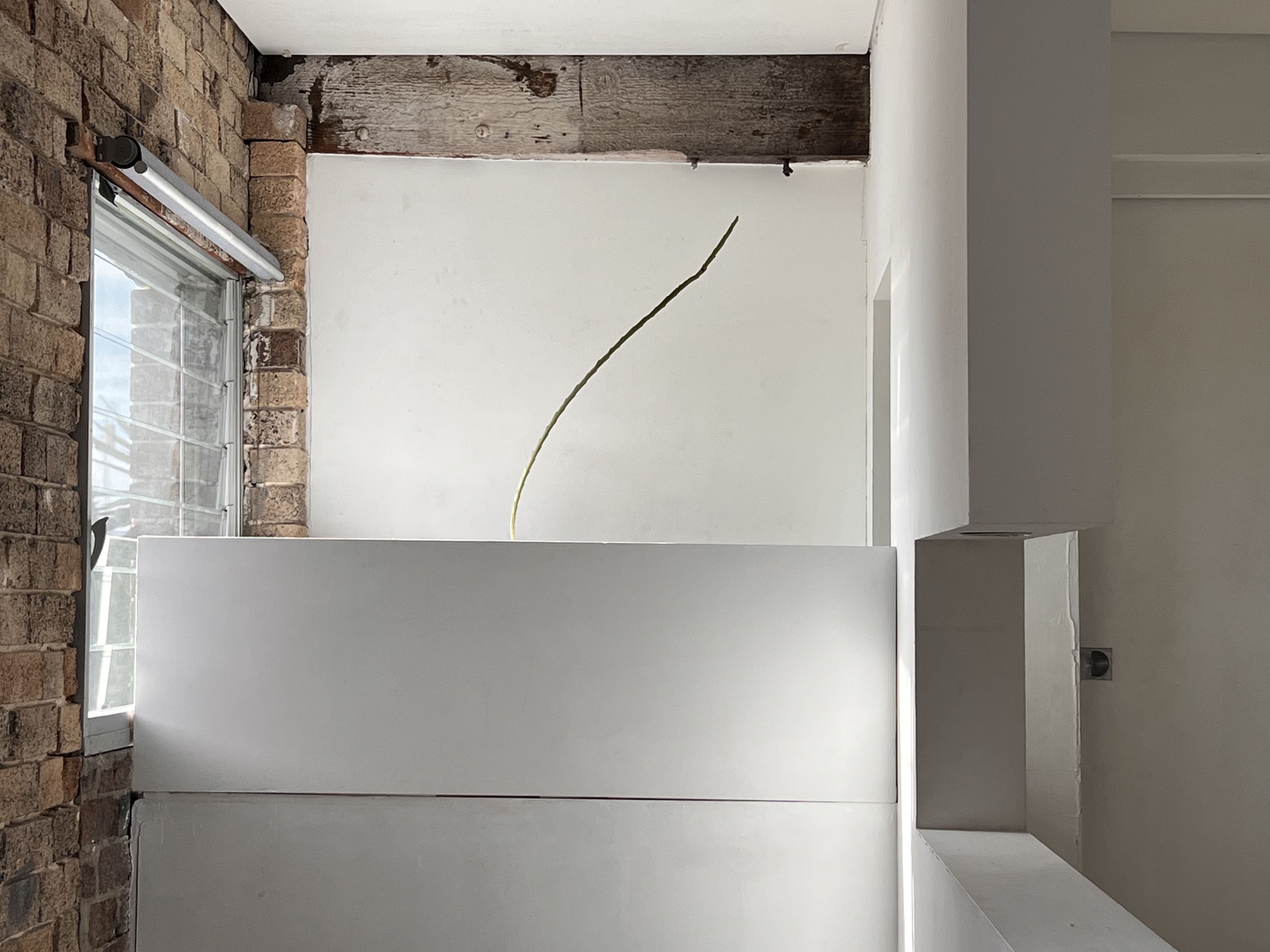 Sue Callanan creates sculptural installations and objects which are responsive to their site- the architecture and its surrounds. The surrounds in this instance, include natural light and air critical to the living form (a plant) that it embraces.