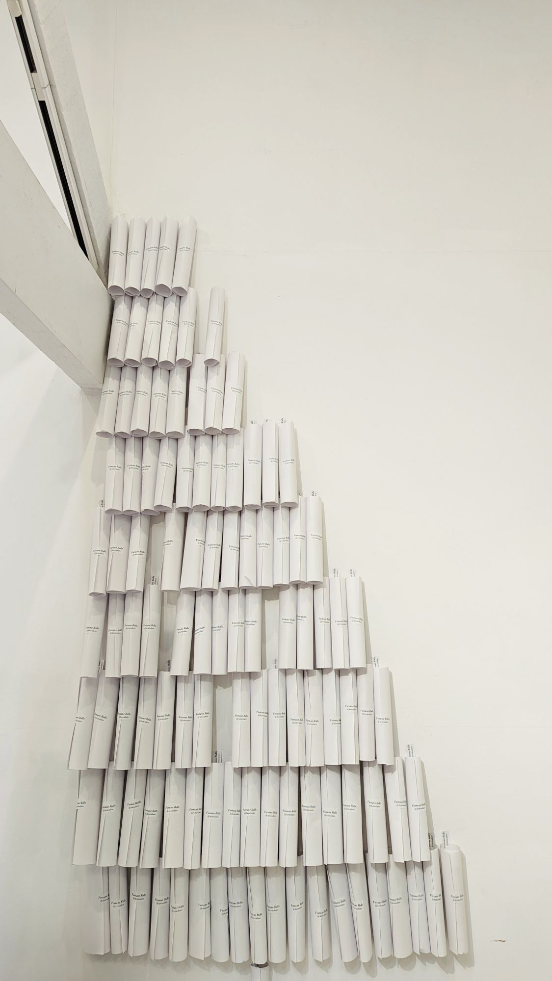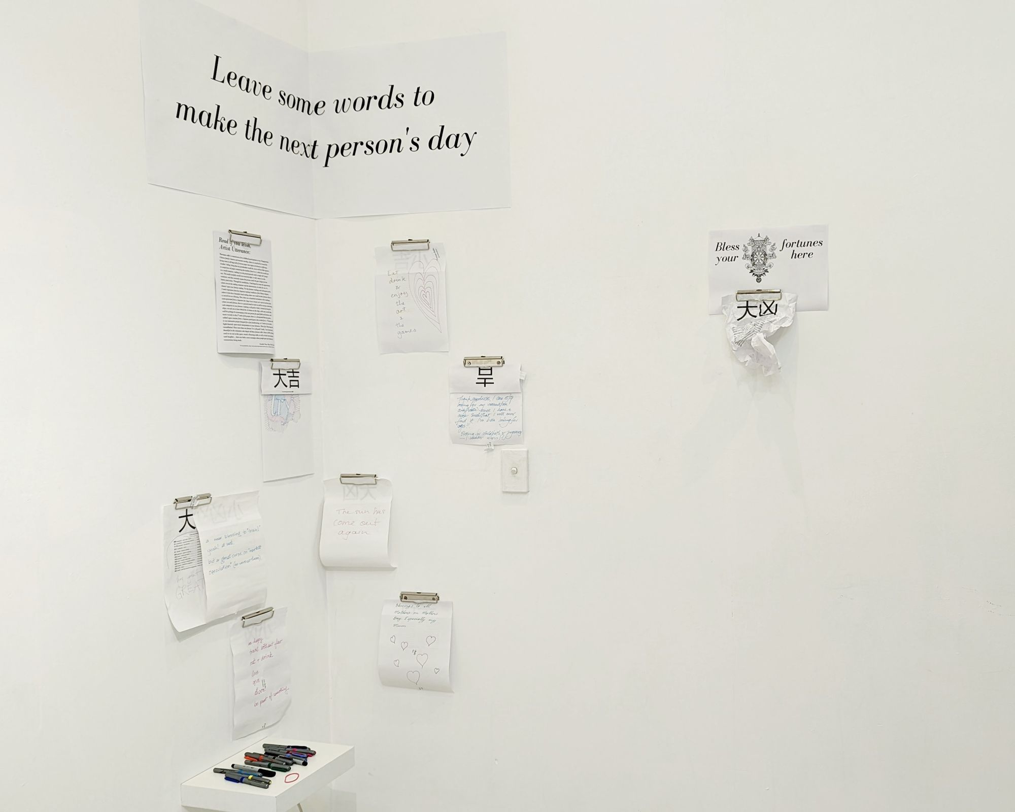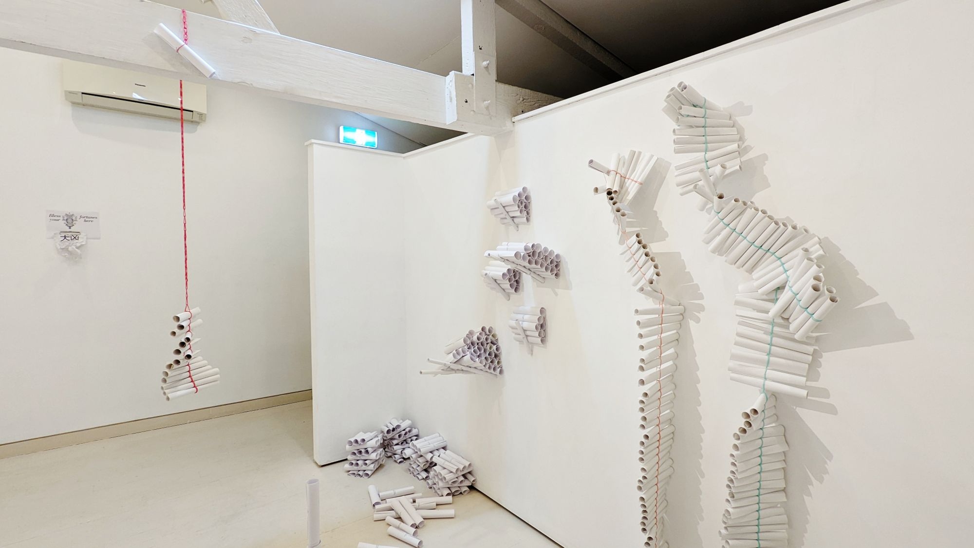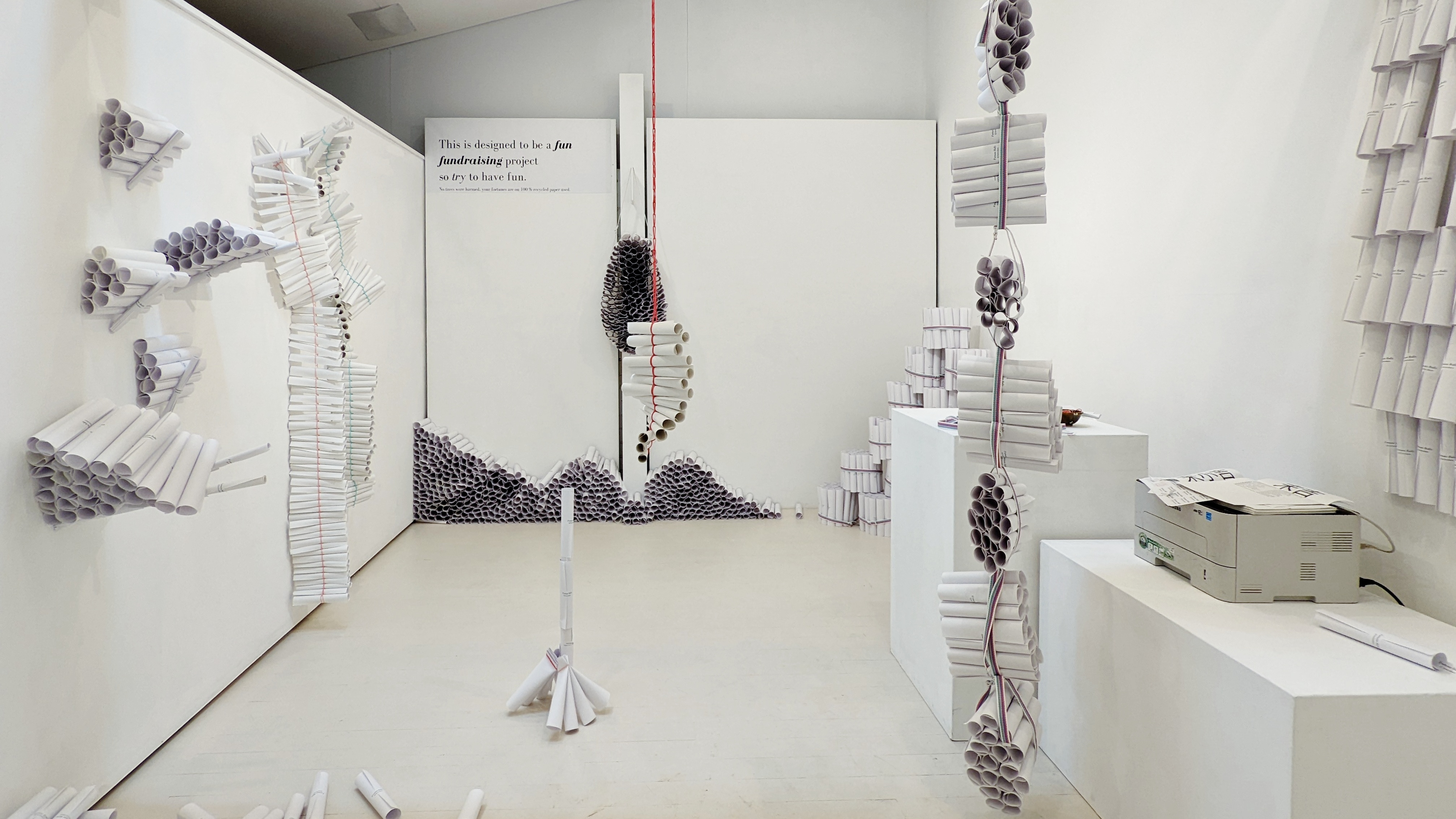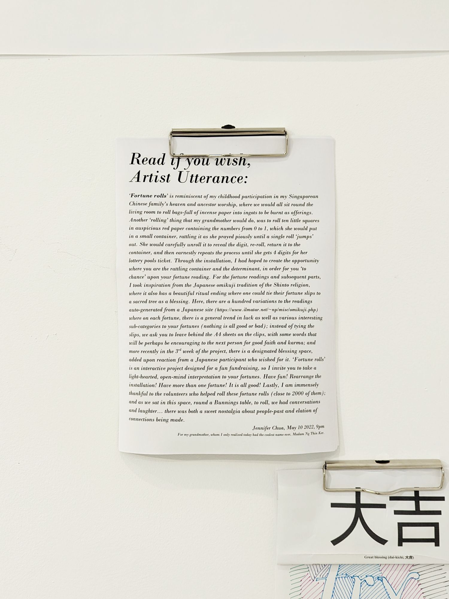 ‘Fortune rolls’ is reminiscent of my childhood participation in my Singaporean Chinese family’s heaven and ancestor worship, where we would all sit round the living room to roll bags-full of incense paper into ingots to be burnt as offerings. Another ‘rolling’ thing that my grandmother would do, was to roll ten little squares in auspicious red paper containing the numbers from 0 to 1, which she would put in a small container, rattling it as she prayed piously until a single roll ‘jumps’ out. She would carefully unroll it to reveal the digit, re-roll, return it to the container, and then earnestly repeats the process until she gets 4 digits for her lottery pools ticket. Through the installation, I had hoped to create the opportunity where you are the rattling container and the determinant, in order for you ‘to chance’ upon your fortune reading. For the fortune readings and subsequent parts, I took inspiration from the Japanese omikuji tradition of the Shinto religion, where it also has a beautiful ritual ending where one could tie their fortune slips to a sacred tree as a blessing. Here, there are a hundred variations to the readings auto-generated from a Japanese site (https://www.ilmatar.net/~np/misc/omikuji.php) where on each fortune, there is a general trend in luck as well as various interesting sub-categories to your fortunes (nothing is all good or bad); instead of tying the slips, we ask you to leave behind the A4 sheets on the clips, with some words that will be perhaps be encouraging to the next person for good faith and karma; and more recently in the 3rd week of the project, there is a designated blessing space, added upon reaction from a Japanese participant who wished for it. ‘Fortune rolls’ is an interactive project designed for a fun fundraising, so I invite you to take a light-hearted, open-mind interpretation to your fortunes. Have fun! Rearrange the installation! Have more than one fortune! It is all good! Lastly, I am immensely thankful to the volunteers who helped roll these fortune rolls (close to 2000 of them); and as we sat in this space, round a Bunnings table, to roll, we had conversations and laughter… there was both a sweet nostalgia about people-past and elation of connections being made.