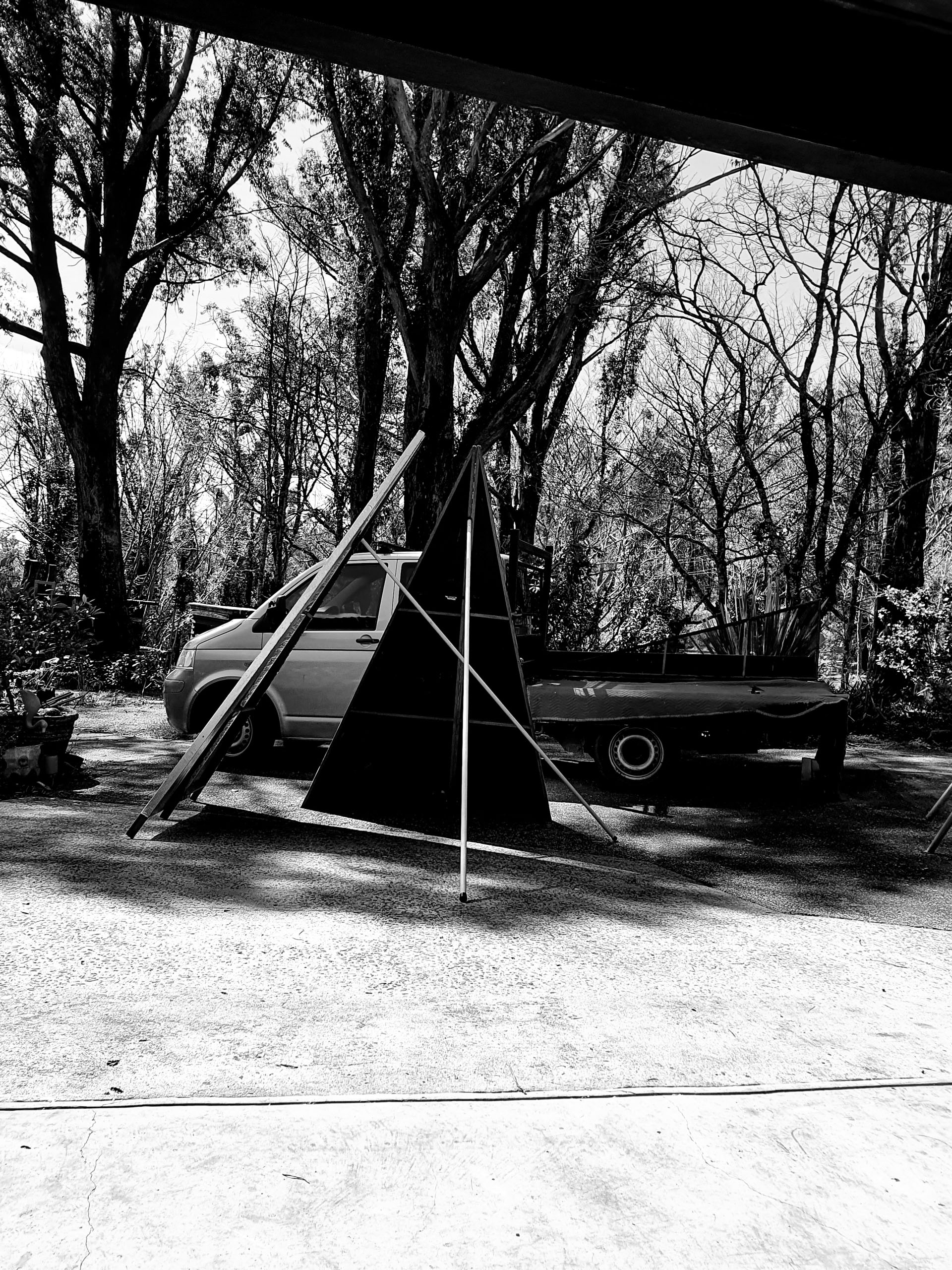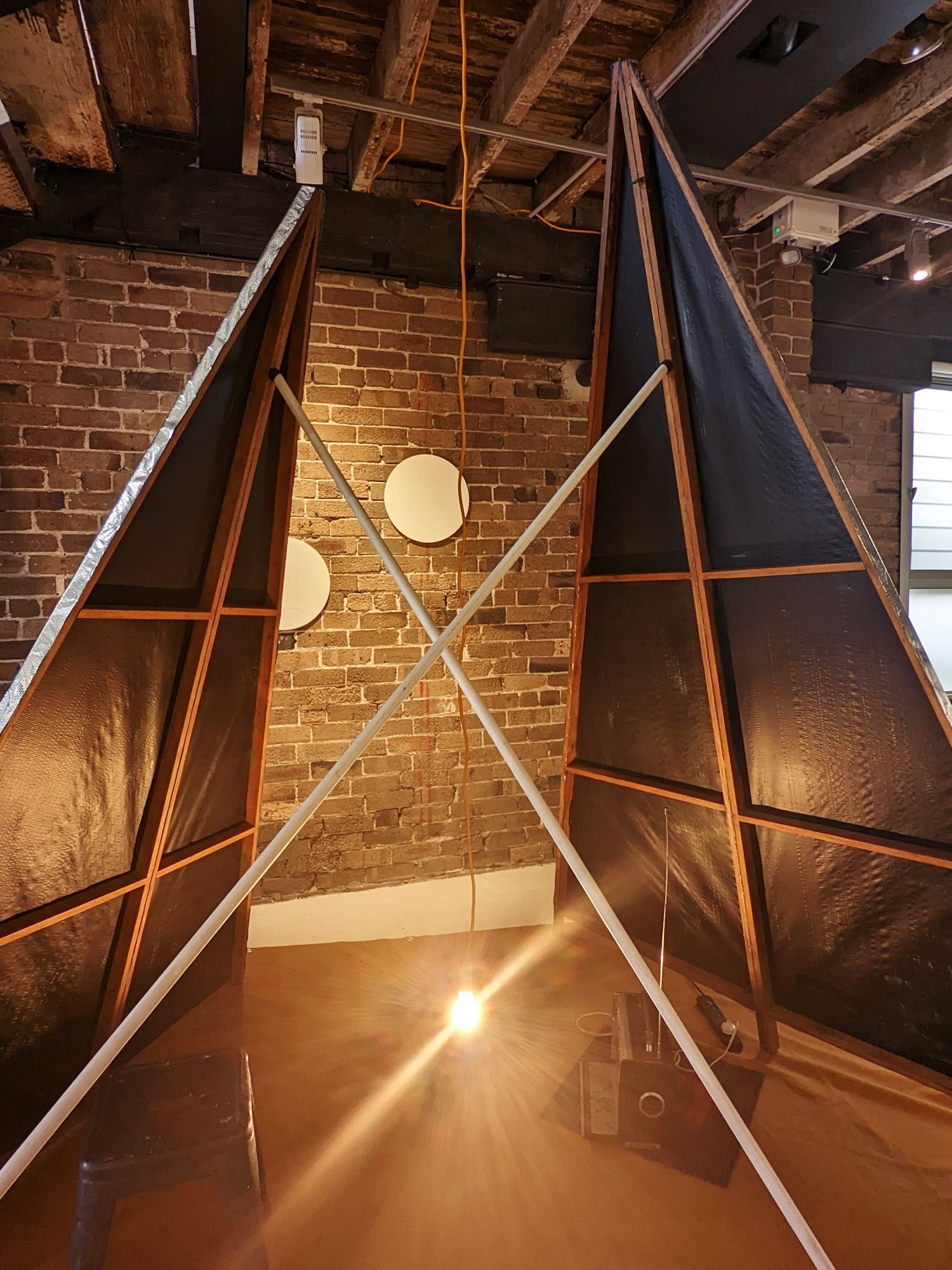 Another featured installation the ‘Punk Studios’ is created by the artists for others to use during an exhibition for their purpose. A series inspired by building lessons given to Gruner from aboriginal musician Graham Davis King on the tradition of Ngurra construction. Later transformed by an architect into a contemporary model on architecture, an intersection in making within contemporary art has been reconstructed over multiple presentations of the same low-cost segments (tinfoil, screws, a light, a radio, and a cloth).