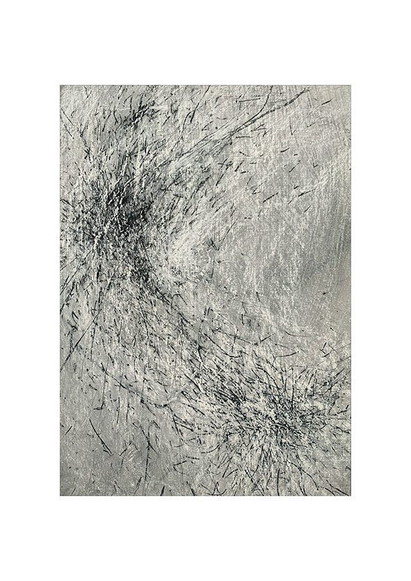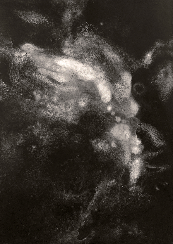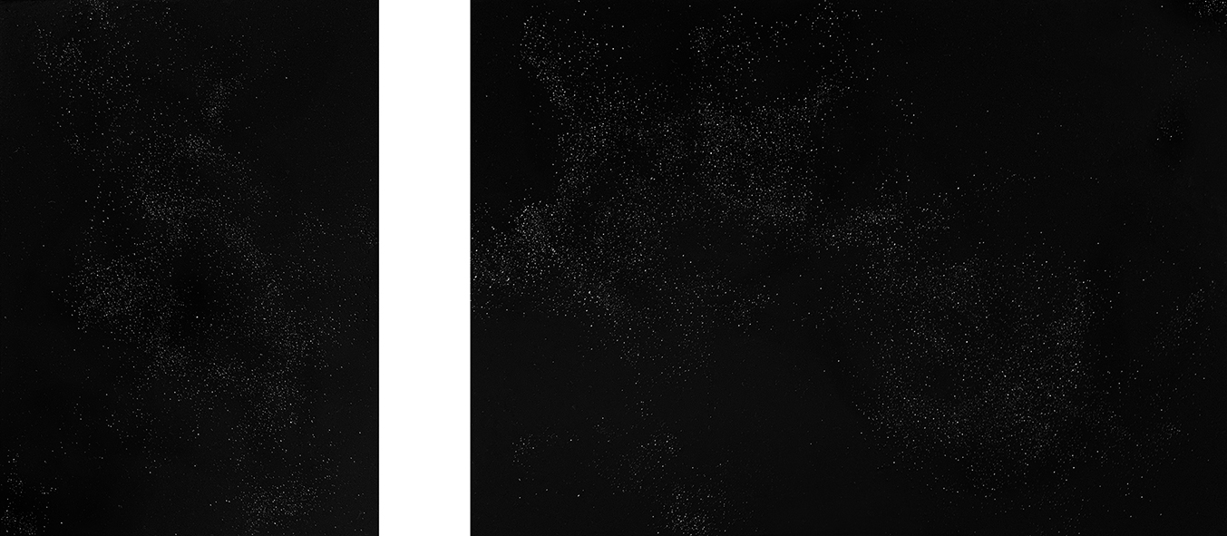 My passion for space exploration and its mysteries has been a source of inspiration for the work presented in this exhibition. Contemporary and historical ideas about the universe, images from outer space, scientific information, and simply gazing at the starry sky on a cloudless night, stir my emotions, challenge my thinking and inform every mark I make in my artworks. My drawings point to profound feelings when contemplating the cosmos, while my paintings and videos evoke the boundless immensity of the universe, the light and darkness of deep space, and the staggering number of cosmic objects scattered in the infinite macrocosm. Through a multi-layered approach, I aim to engage the senses and imagination, and to evoke a state of mind associated with the experience of the cosmic sublime.