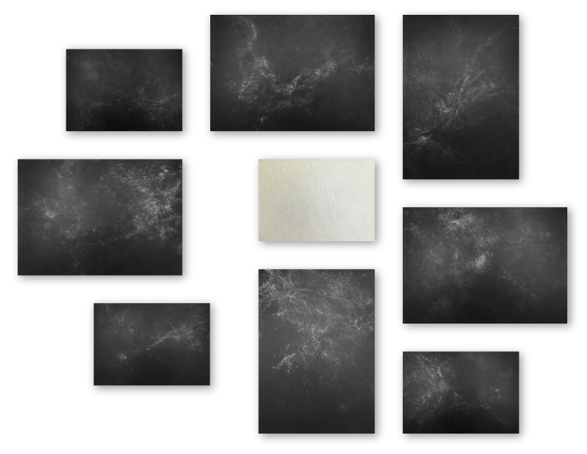 Acrylic and metallic powders on canvas, 9 paintings, A3 and A2 sizes.