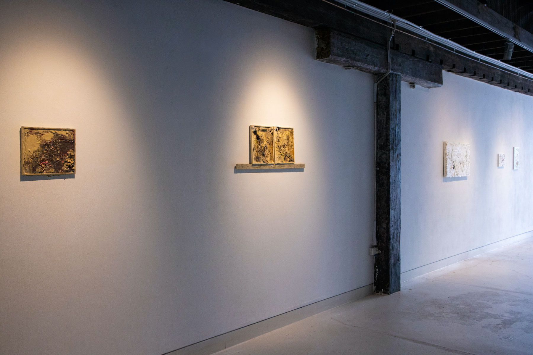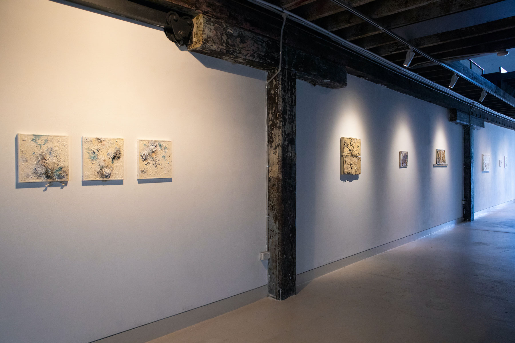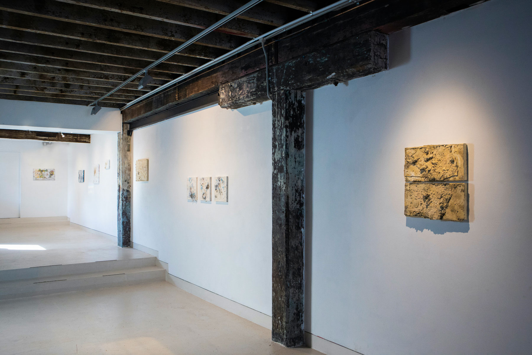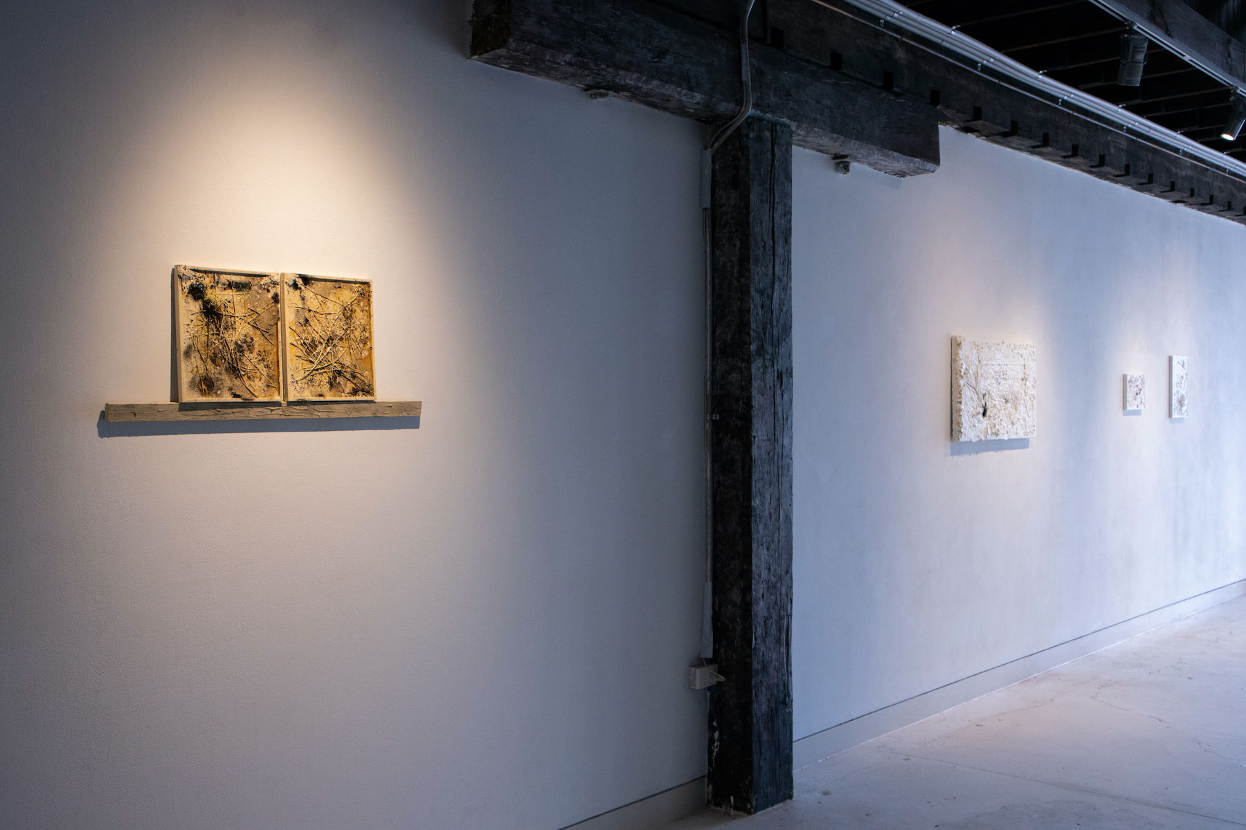 Henry Hu’s approach is both spontaneous and exact. Limiting his range of tonal palette within each work, the paintings combine a multi-layered technique of paint pours with an ecosystem of raw, earthly materials—mixing sand, gravel, twig, leaf, grass, and wood. The process is fluid, but ever precise and assertive. Each element tunnels into, intertwines with the other, constructing an architecture of forms, colours and texture. A delicate manipulation of material that traces the ambiguity of nostalgia. The end result materialises as an account of time, consciousness made visible. At heart, the works are an embodiment of the natural world, to preserve what is fleeting, a piece of reflection, a quiet wonder.