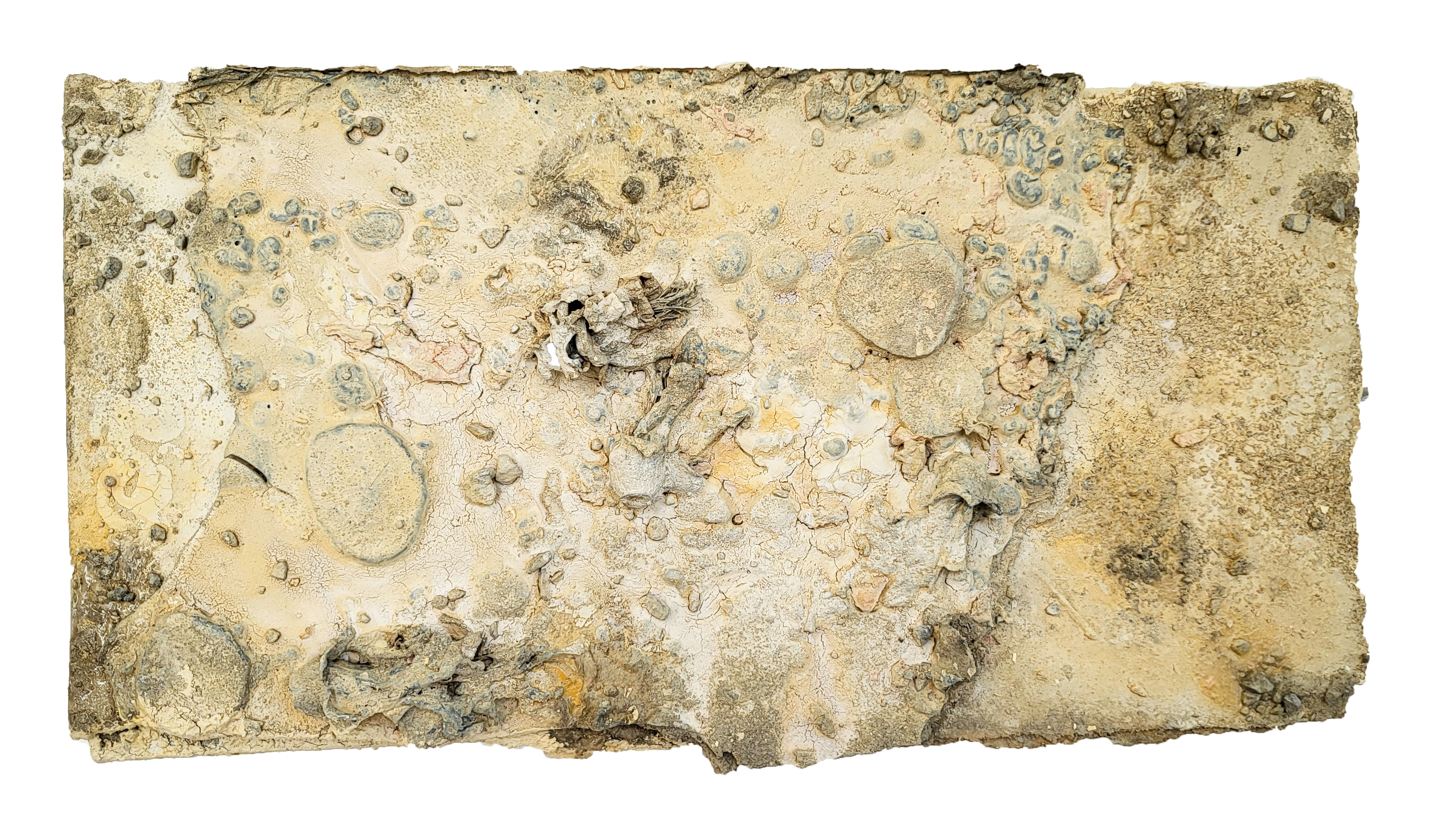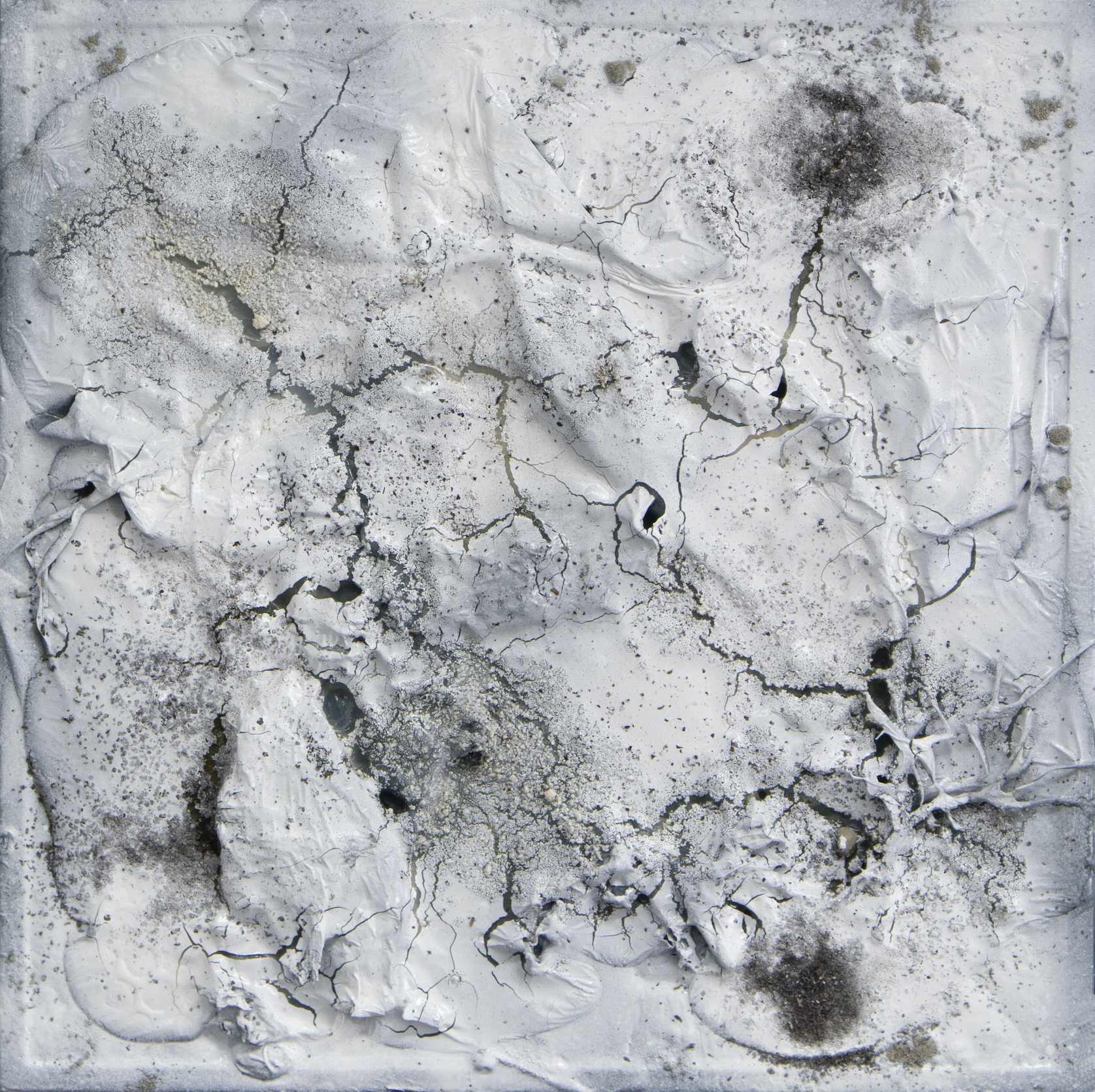 3. Henry Hu, The Hive Itself a Teacup #10, 2023, gravel, sand, bark, tea leaf, herb, seed, cardboard, adhesive, and acrylic on canvas