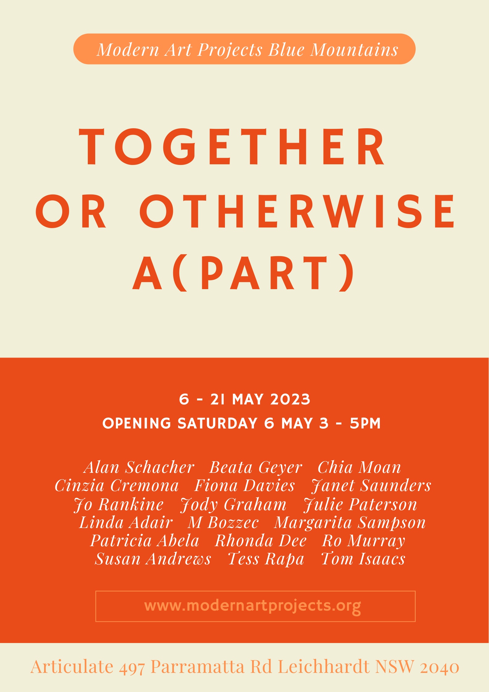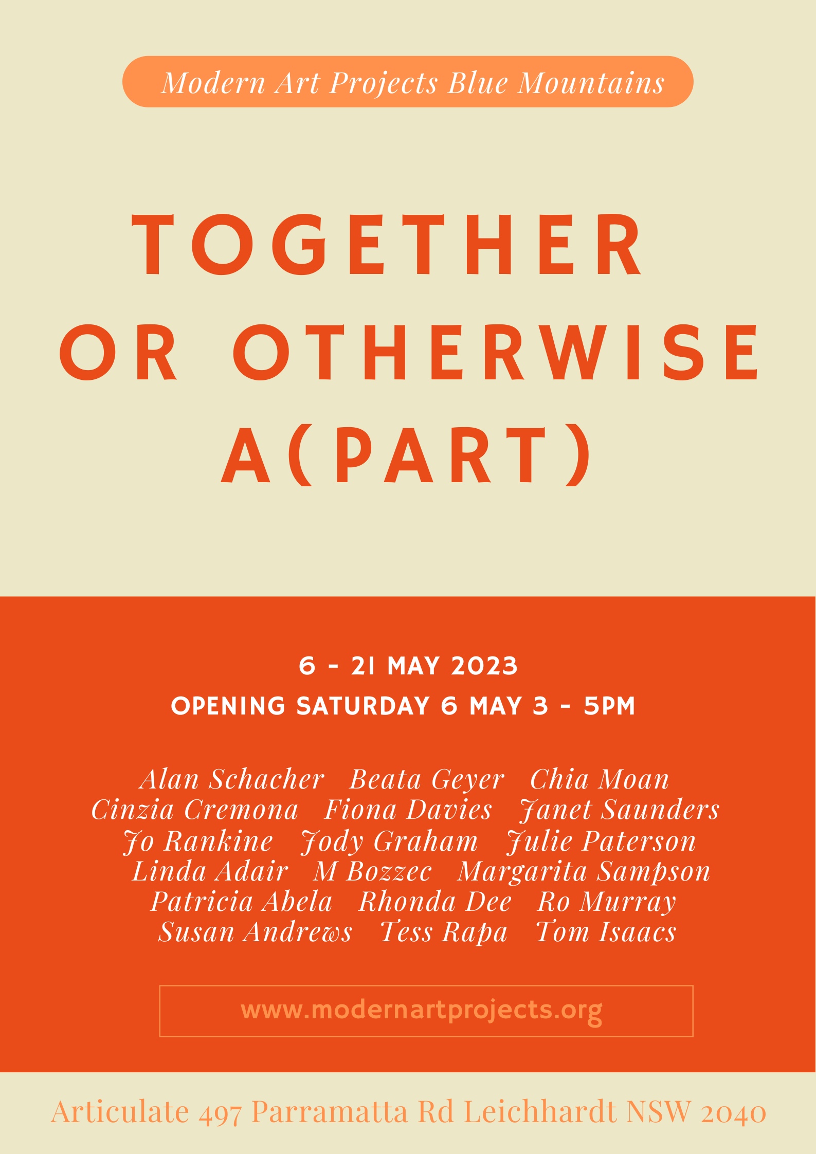 Together or otherwise a(part) is a Modern Arts Project Blue Mountains project. MAPBM supports and advocates for the development, production and exhibition of contemporary, multi-form art in the Blue Mountains. The group aims to foster an independent environment that supports the practice of artists and curators and to engage with the wider Blue Mountains community in delivering a new critical agenda for the contemporary.