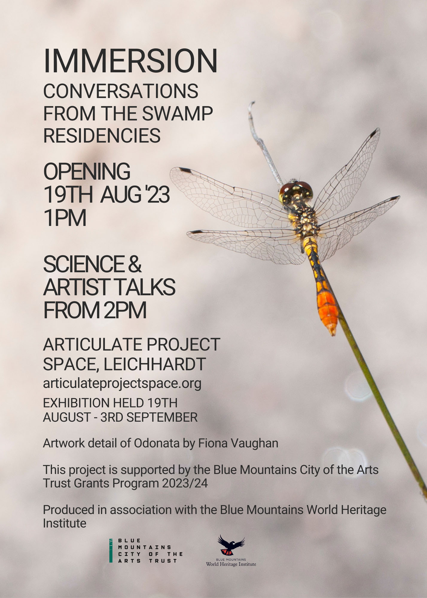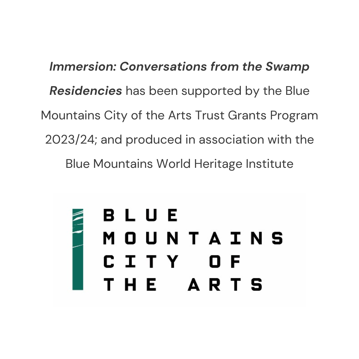 Opening for 'Immersion: Conversations from the Swamp Residencies, featuring Anne Campbell, Ann Niddrie, Bryden Williams, Caroline Giniunas, Cheryle Yin Lo, Chia Moan, Emma Magenta, Fiona Vaughan, Freedom Wilson, Jon Flood, Jon Macleod, Justin Morrissey, Kate Reid, Rani Brown, Scott Marr, Wendy Tsai Co-curatored by Freedom Wilson & Justin Morrissey This project is supported by the Blue Mountains World Heritage Institute, Join the Artists from the Swamp Residencies in conversation about Science and Art, Opening for group show 'Badlands' Downstairs, featuring Kirsten Drewes, Judy-Anne Moule, Helen Redmond, Elizabeth Rankin; and 'Dark Turn' in the Backroom by Chris Packer. Also Upstairs, painting-in-progress project 'Resolution:Sublimate' by Catherine Zimdahl, commences.
