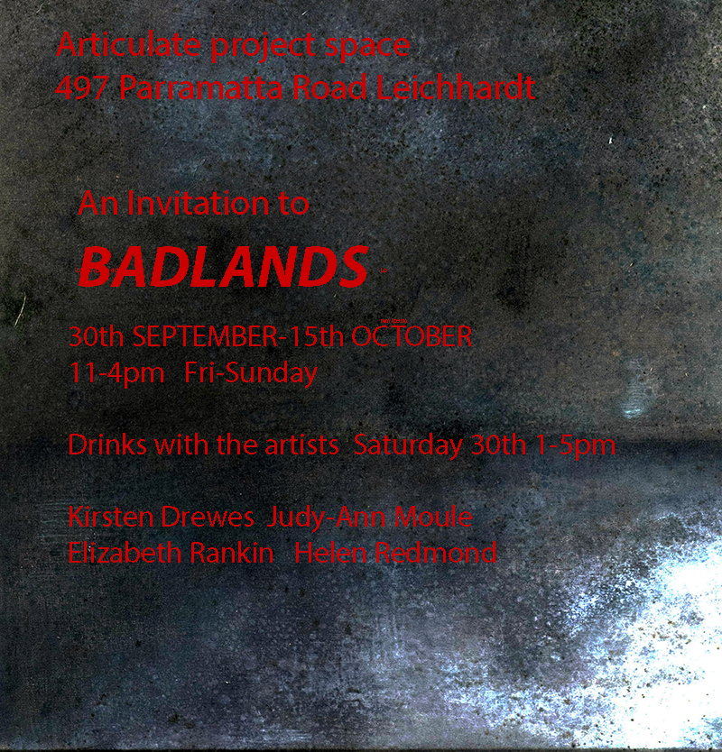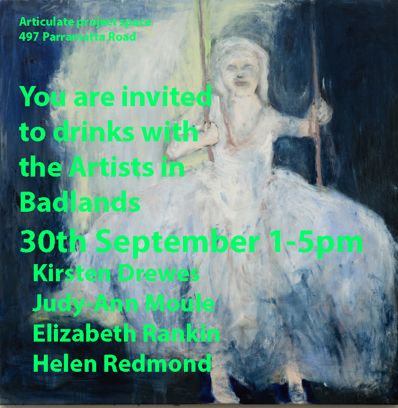 Opening for group show 'Badlands' Downstairs, featuring Kirsten Drewes, Judy-Anne Moule, Helen Redmond, Elizabeth Rankin; and 'Dark Turn' in the Backroom by Chris Packer. Also Upstairs, painting-in-progress project 'Resolution:Sublimate' by Catherine Zimdahl, commences.