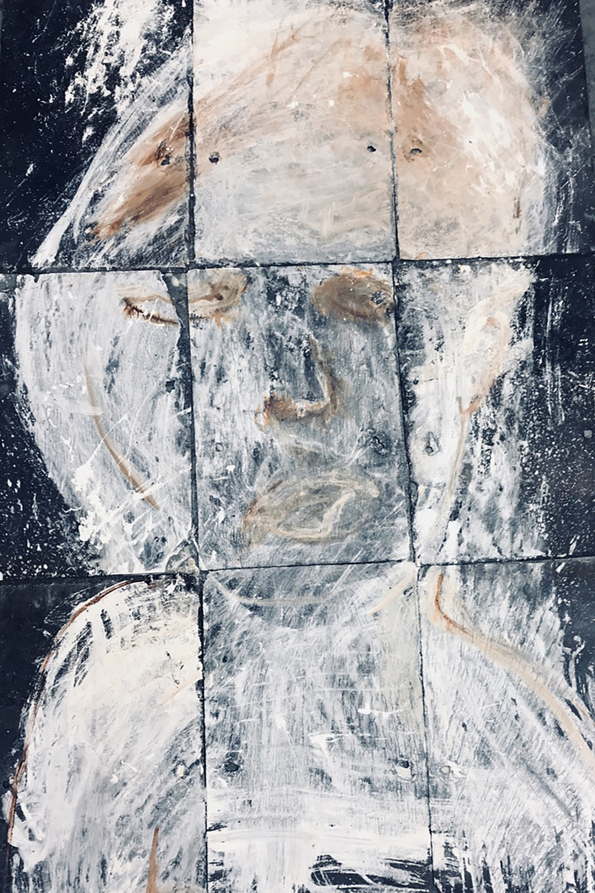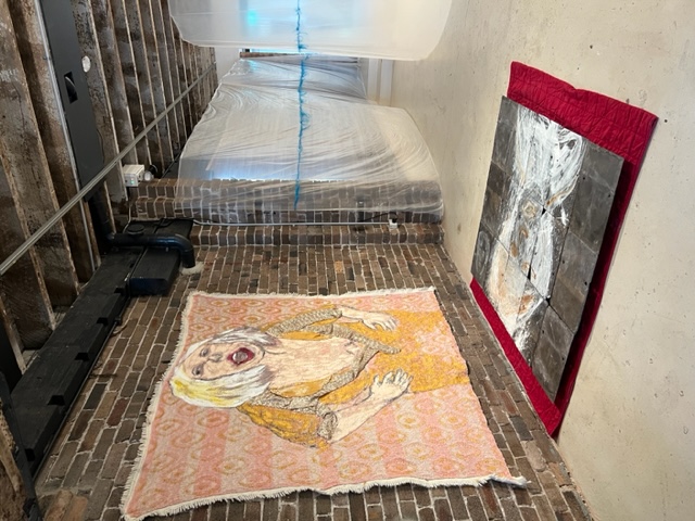18. Elizabeth Rankin IMG-2336- 1.Triumph of the Femme Fatale oil and fabric collage on Bedspread 2023 2.The Corpse considers Her Options- White ink on Welsh slate in floorwork.2022