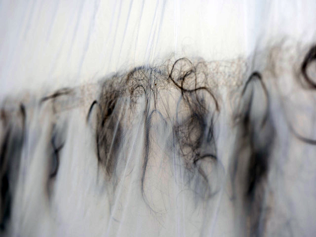 Judy-Ann Moule examines how a contemporary visual arts practice can add diversity to the current dialogue around sexual violence. In a floor to ceiling installation, she creates an abject corridor of sheer film and human hair mounted at face level, to explore violation through dis/touch – a portmanteau of touch and disgust.