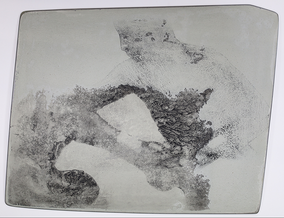 Barbara Campbell’s screenprints come from imagery she collected in Rome during her 2022 residency at the American Academy in Rome (AAR). The AAR holds many specialised collections from ancient Rome, most of it stored away from public view and accessible to scholars with special permissions. However, the AAR’s collection of Roman epigraphy (Latin inscriptions incised into marble, often commemorating the heroic lives of Roman soldiers), is displayed openly, embedded into the walls surrounding the central courtyard. Without knowledge of Latin, Campbell chose to extract only the vowels (the building blocks of English) from the collection, using a simple graphite rubbing technique, thereby creating a sub-collection from the collection. The Latin V form of the later English U is a reminder of, and disturbance caused by, the source material. Each print is uniquely misregistered and shimmers with aluminium particles.