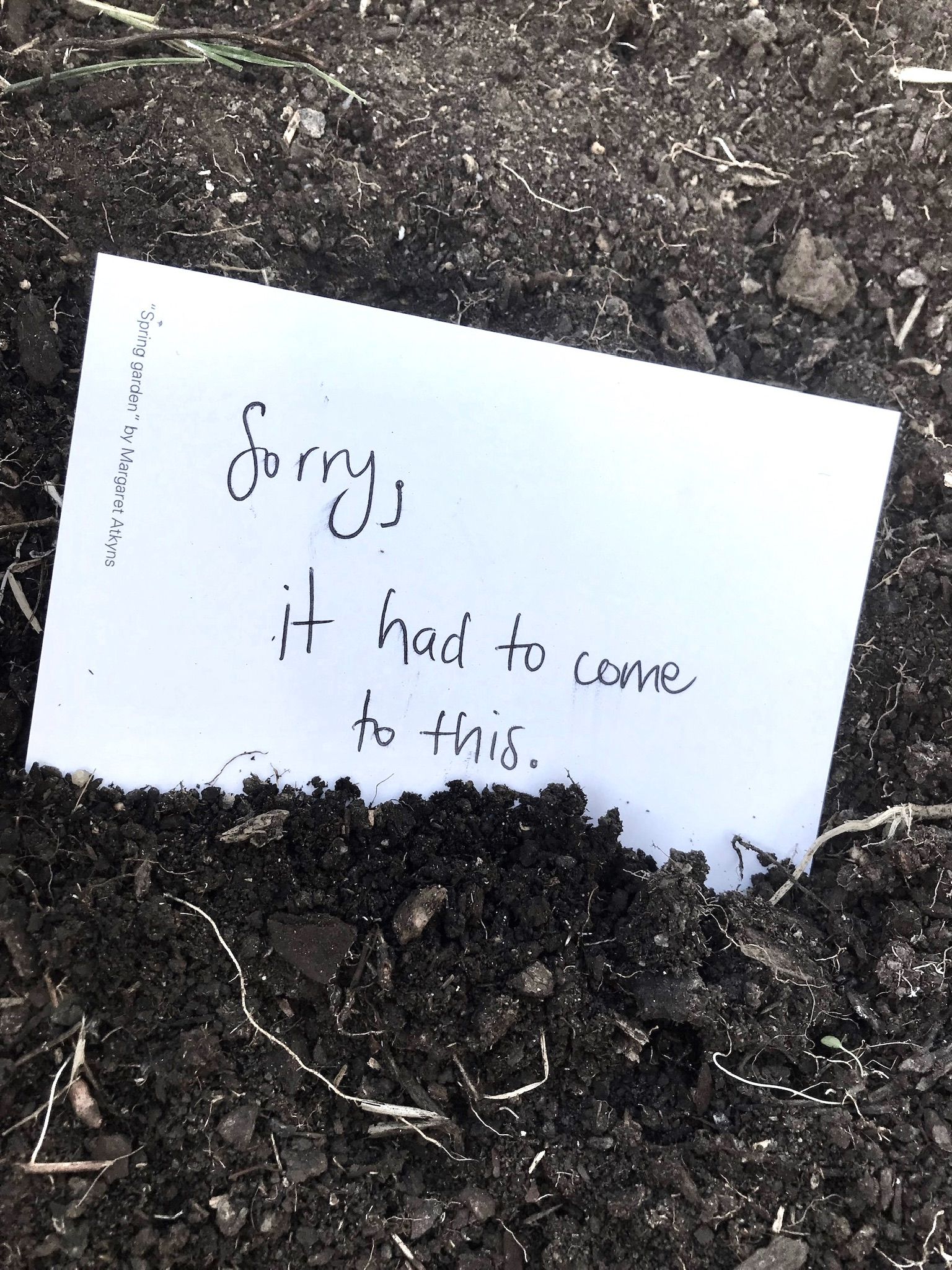 GRAVES is a multi-material installation that explores our current human-induced environmental and ecological challenges. It marks a haunted knowing that humans have plundered and imperilled the land with little long-term consideration of their impact. With this in mind, GRAVES involved the artist writing postcard messages of apology to the Earth on postcards, and then burying them. The apologies, however, are blithely written with trite and disingenuous words, encapsulating the prevailing human attitude that wrongs can be made right via a simple apology. If the apologies are not genuine and heartfelt, then can the Earth ever offer its forgiveness? (With thanks to The CORRIDOR Project, NSW.)