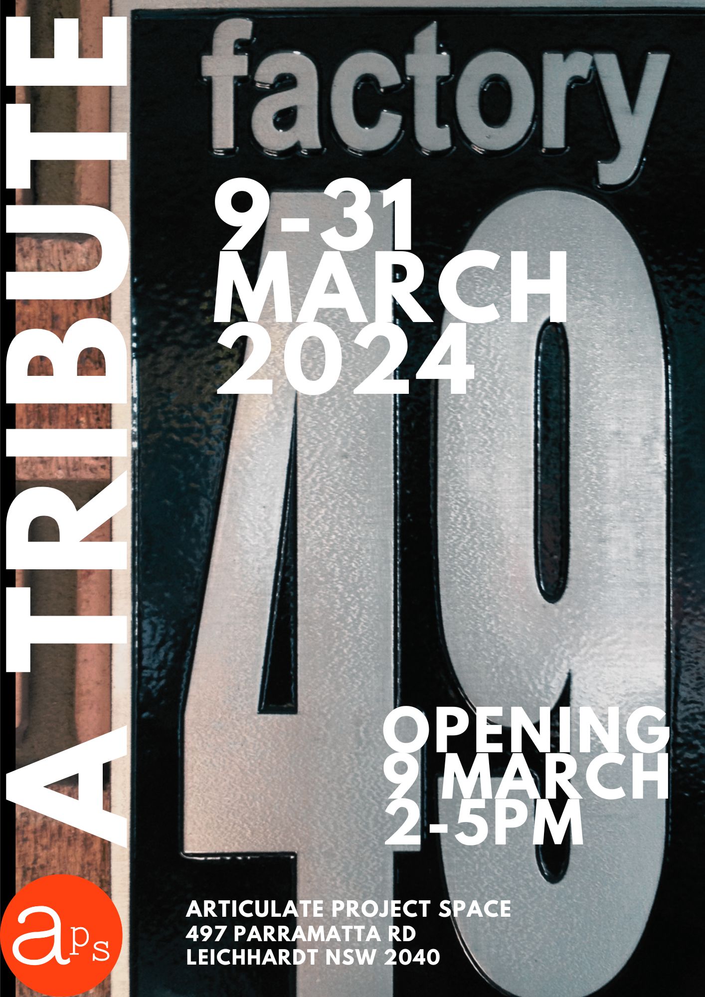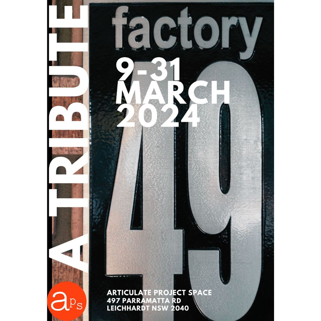 Invitation to participate in 'FACTORY 49. A Tribute' was extended to all artists who exhibited in Factory 49. The exhibition showcases 67 artists from Australia, New Zealand, France and Germany with artworks either from their Factory 49 shows or new works.