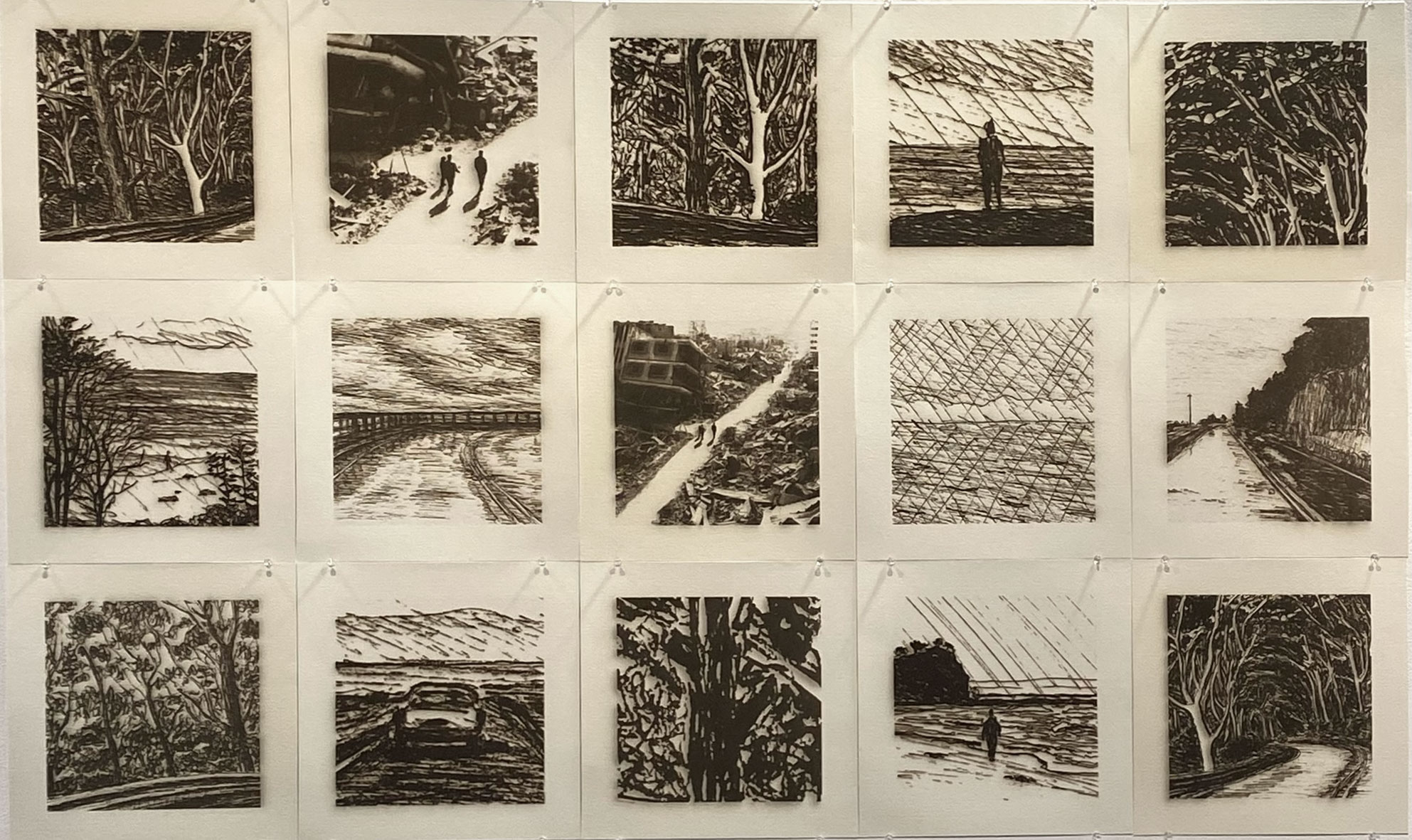 Other works deal with the same theme, but are also about thinking and digression, and the source material is more diverse: a lot of the images are details from ink drawings of driving, walking on the beach etc, but also incorporate images taken off the TV as well as images of texts from books.